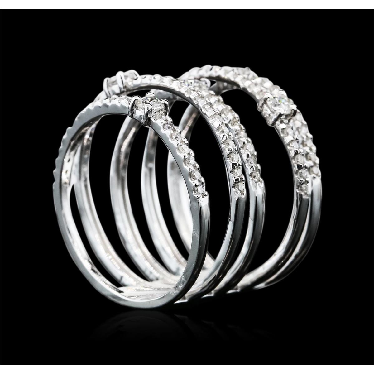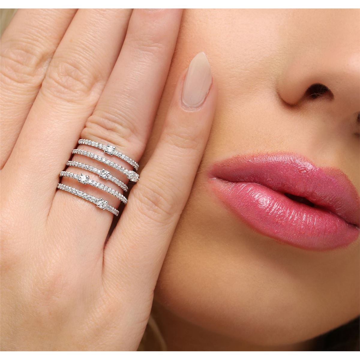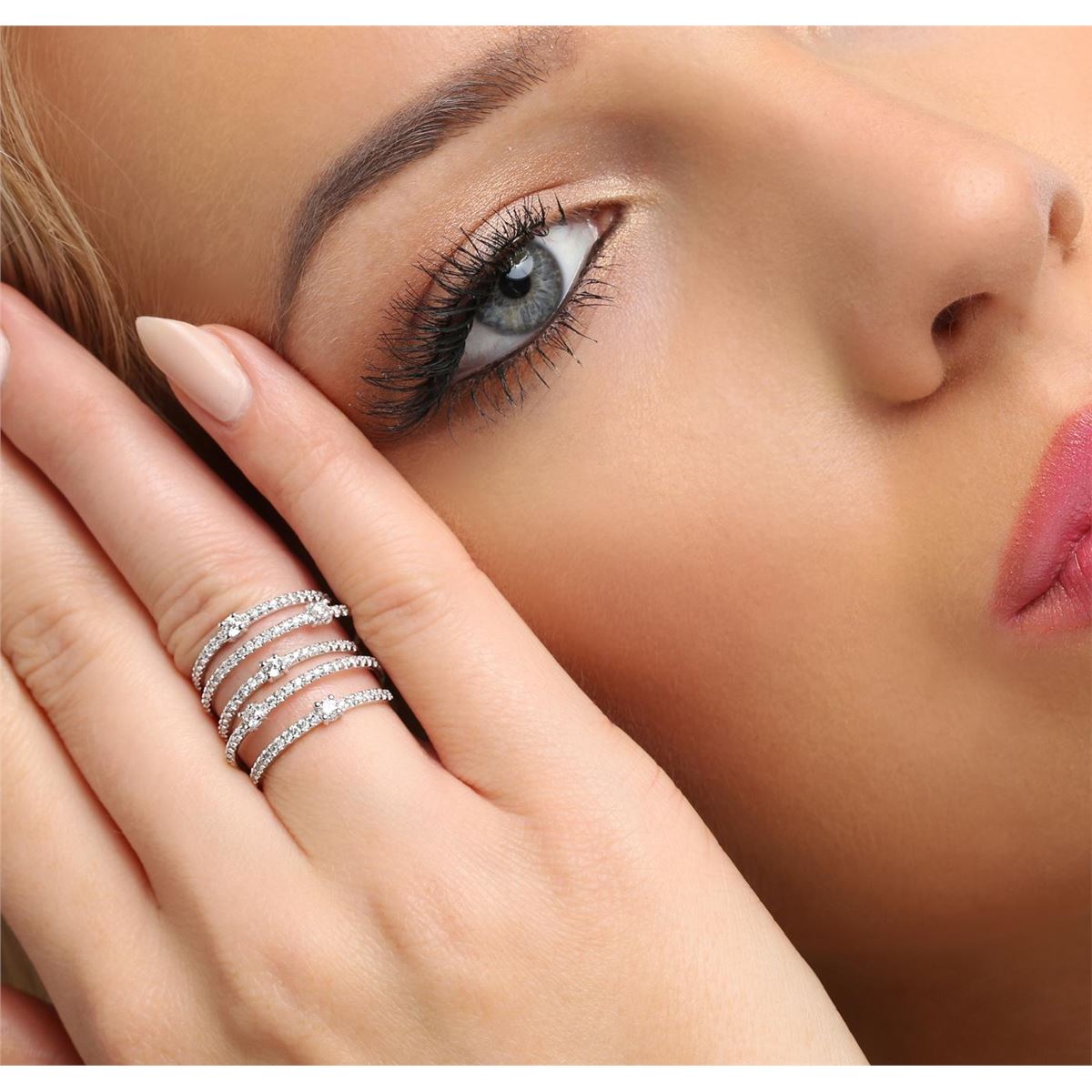 One electronically tested 14KT white gold ladies cast diamond ring with a bright polish finish. Identified with markings of "14K". Condition is new. Containing: Five prong set round brilliant cut diamonds, measuring 2.50 - 2.50 x 1.50mm (depth est.) approximate total weight of 5 Stones = 0.29ct. Clarity: SI-1 to SI-2. Color: J - K, Cut is Good. One Hundred prong set round brilliant cut diamonds, measuring 1.10 - 1.10 x 0.66mm (depth est.) approximate total weight of 100 Stones = 0.48ct. Clarity: I-1. Color: I - J, Cut is Good. All diamonds are graded in the mounting, unless otherwise stated. Total Weight of Diamonds 0.77ct. Total Weight of Ring 5.70 grams. GGL Appraised at $4,470.00.