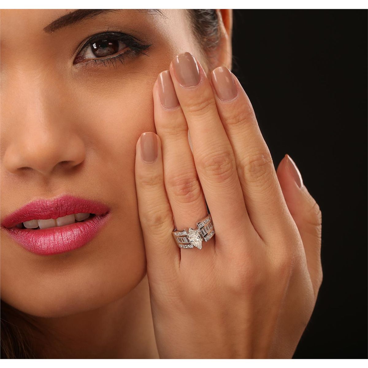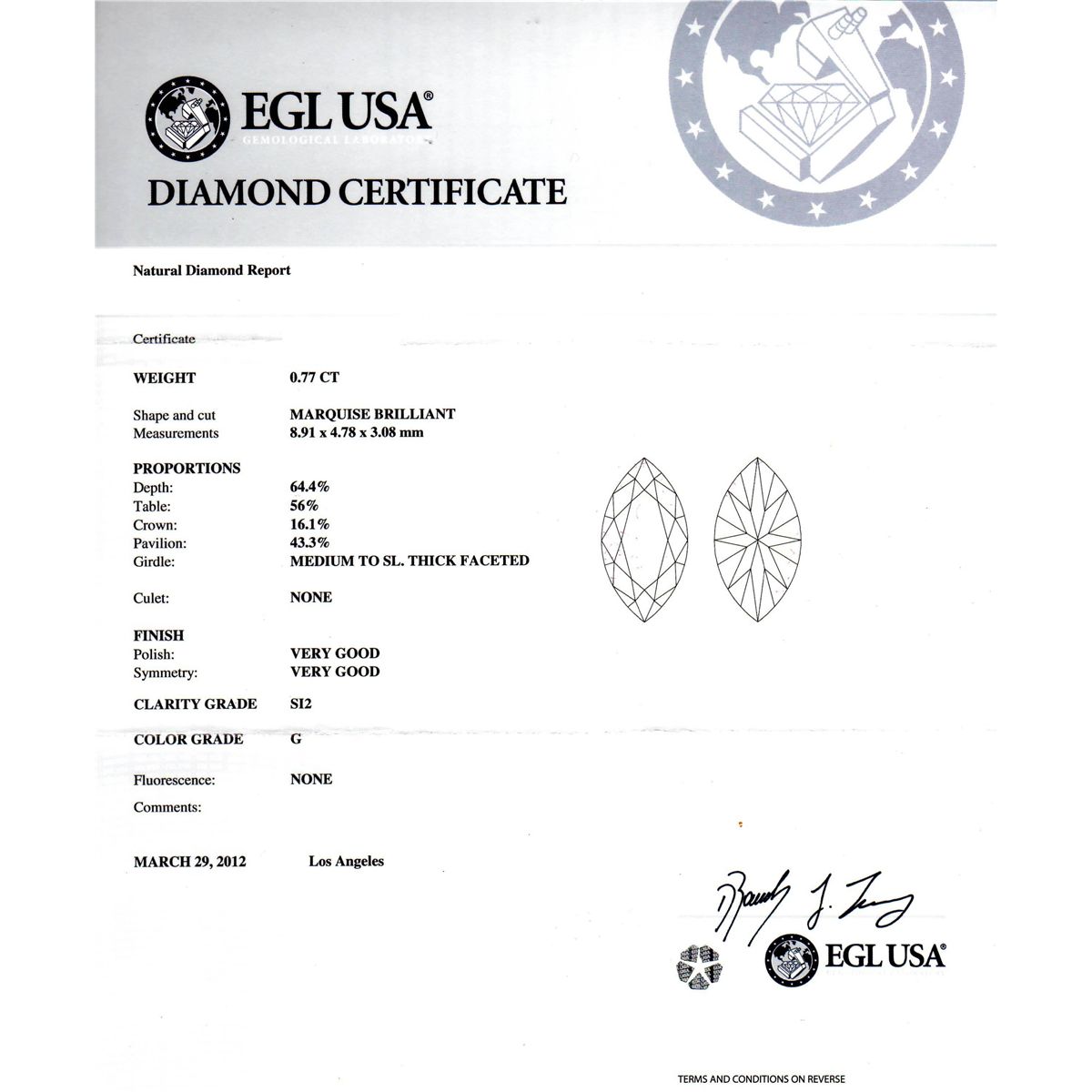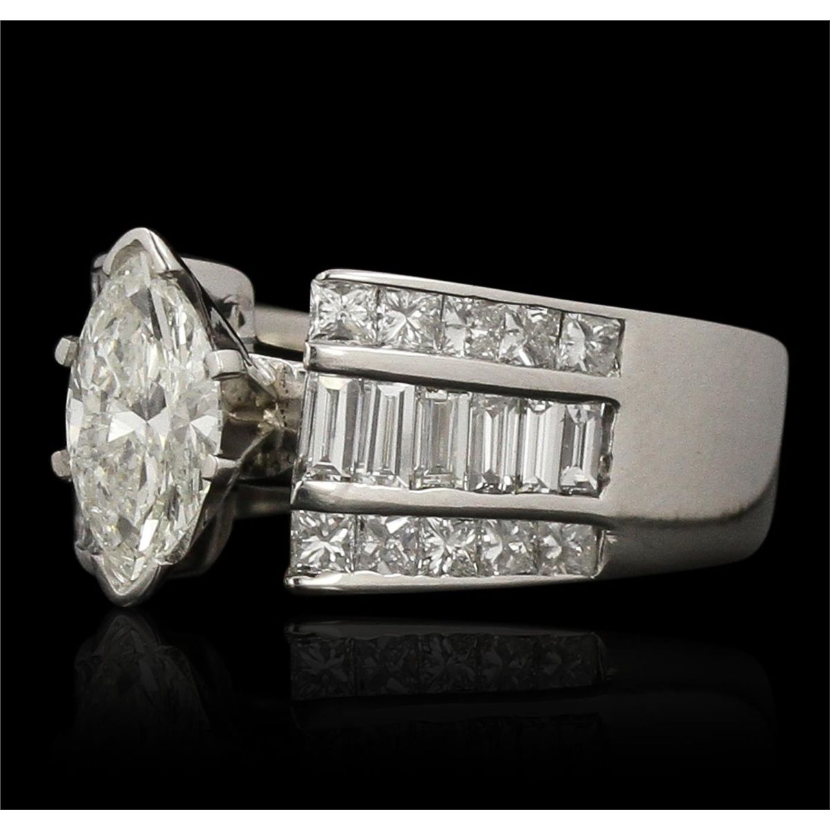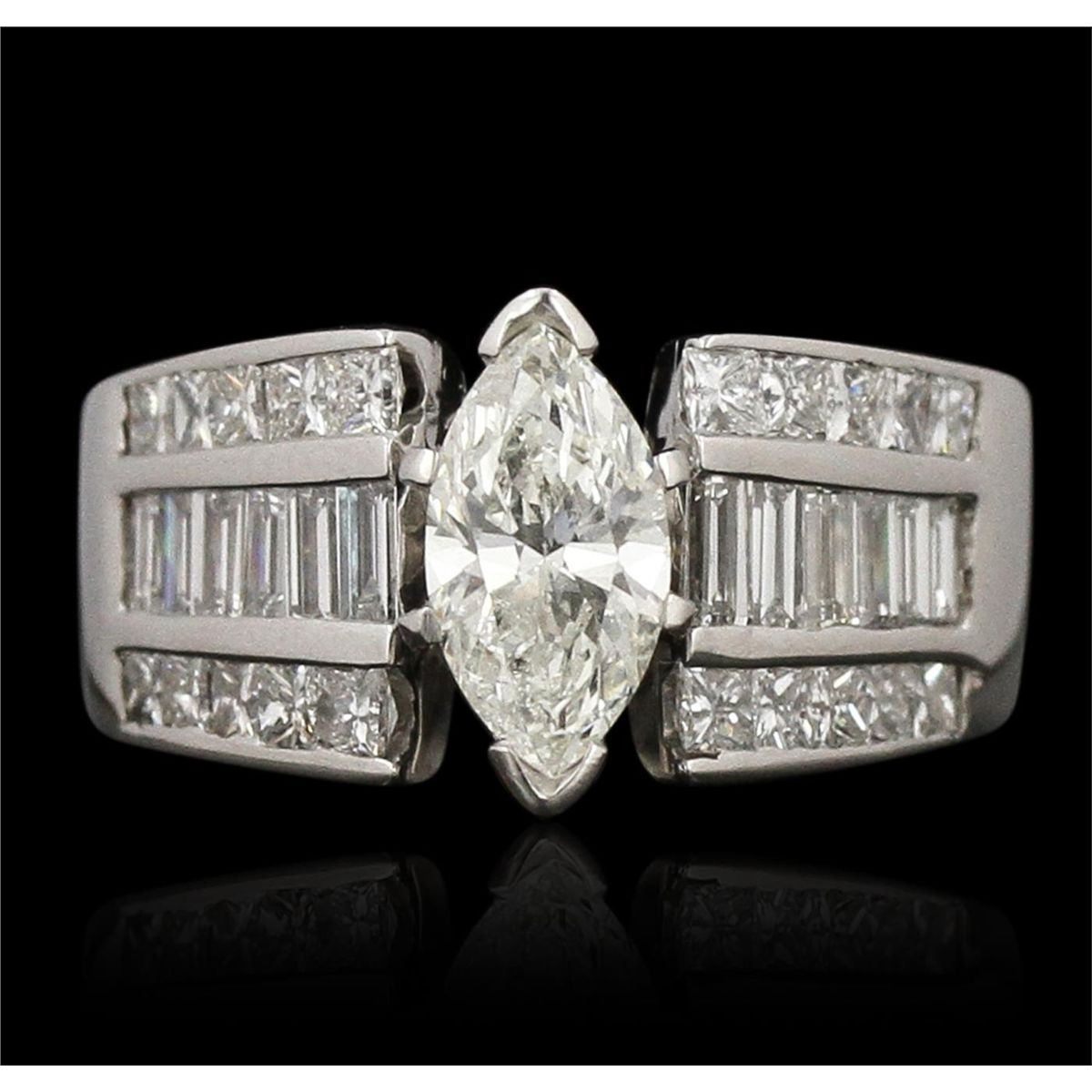 One 14KT white gold ring with a weight of 6.6 grams, (1) EGL USA certified center diamond weighing 0.77ct, marquise brilliant cut, measuring 8.91 x 4.78 x 3.08mm, a depth of 64.4%, table 56%, crown 16.1%, pavilion 43.3%, girdle medium to SL. thick faceted, clarity grade SI2, color grade G. Adjacent diamonds with a total weight of 0.48ctw. UGS MiniAppraised at $5,120.00.