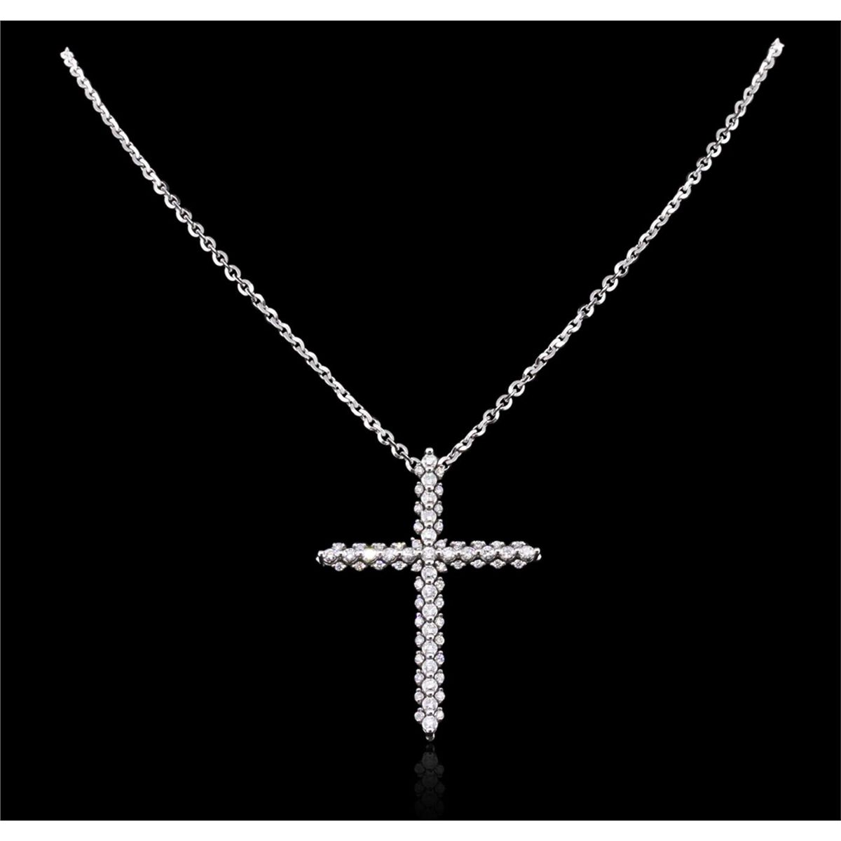 One electronically tested 14KT white gold ladies combination cast & assembled diamond cross pendant & chain 18.0" long, large cable link with a lobster claw clasp with a bright polish finish. Identified with markings of "14K". Condition is new. Containing: Sixty-Nine prong set round brilliant cut diamonds, measuring 1.80 - 1.10 x 0.87mm (depth est.) approximate total weight of 69 Stones = 0.77ct. Clarity: SI-2 to I-1. Color: I - J, Cut is Good. All diamonds are graded in the mounting, unless otherwise stated. Total Weight of Diamonds 0.77ct. Total Weight of Pendant & Chain 11.20 grams. GGL Appraised at $4,280.00.