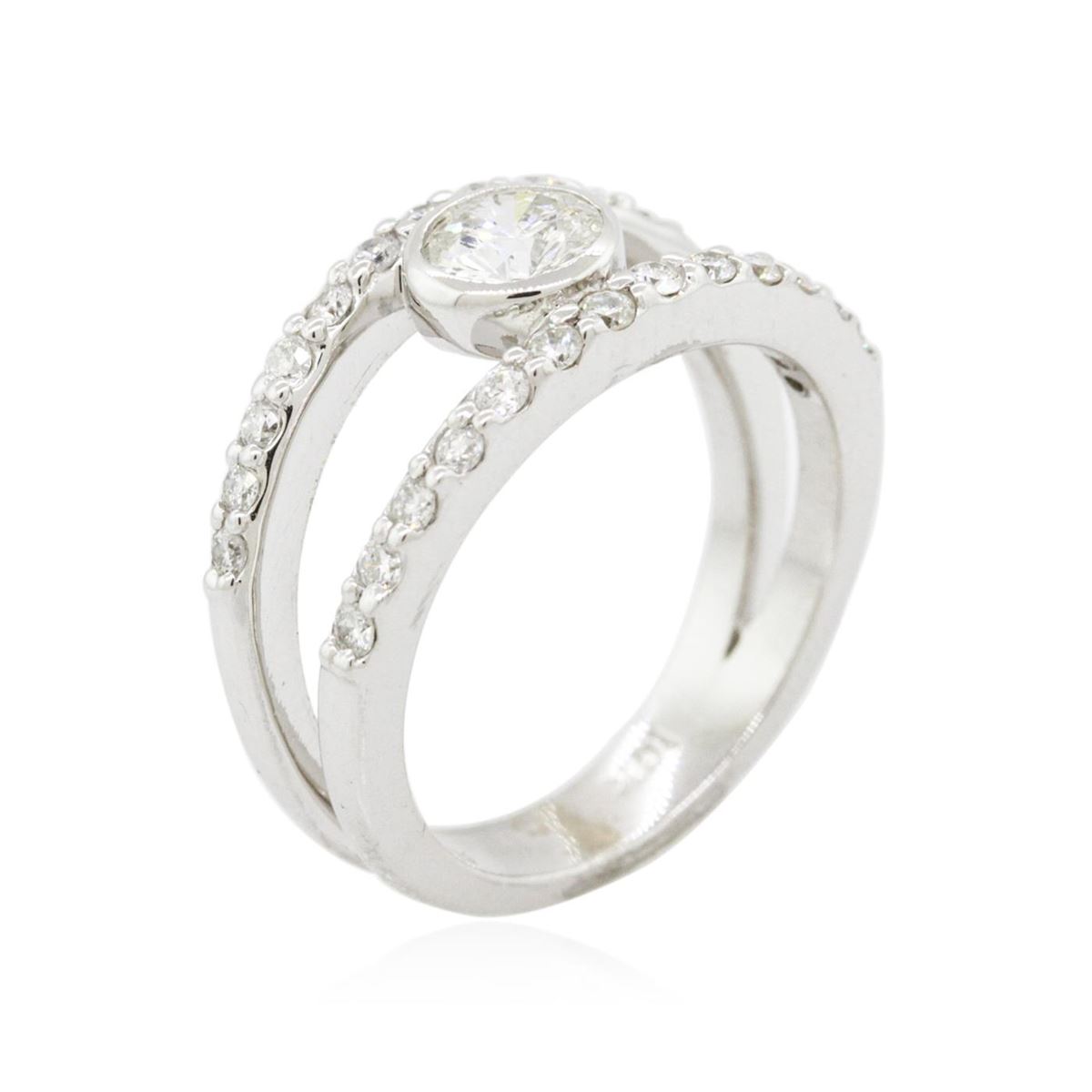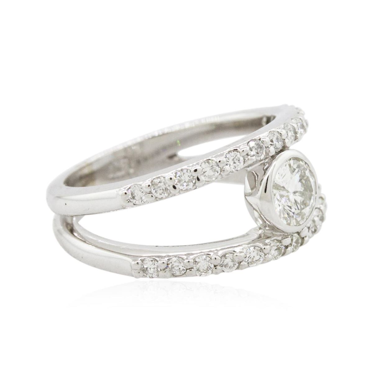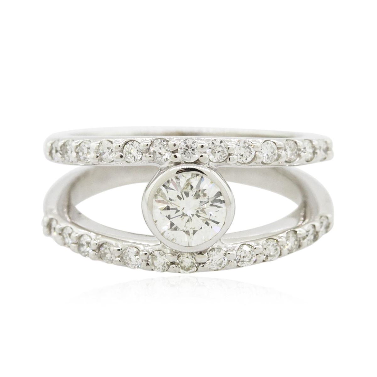 One electronically tested 14KT white gold ladies cast diamond engagement ring with a bright polish finish. Identified with markings of "14K". Condition is new. Containing: One bezel set round brilliant cut diamond, measuring 5.00 - 5.00 x 3.00mm (depth est.) approximate weight of 0.46ct. Clarity: I-1. Color: K, Cut is Good. Twenty-Six prong set round brilliant cut diamonds, measuring 1.50 - 1.50 x 0.90mm (depth est.) approximate total weight of 26 Stones = 0.32ct. Clarity: SI-2 to I-1. Color: I, Cut is Good. All diamonds are graded in the mounting, unless otherwise stated. Total Weight of Diamonds 0.78ct. Total Weight of Engagement Ring 5.10 grams. GGL Appraised at $3,890.00.