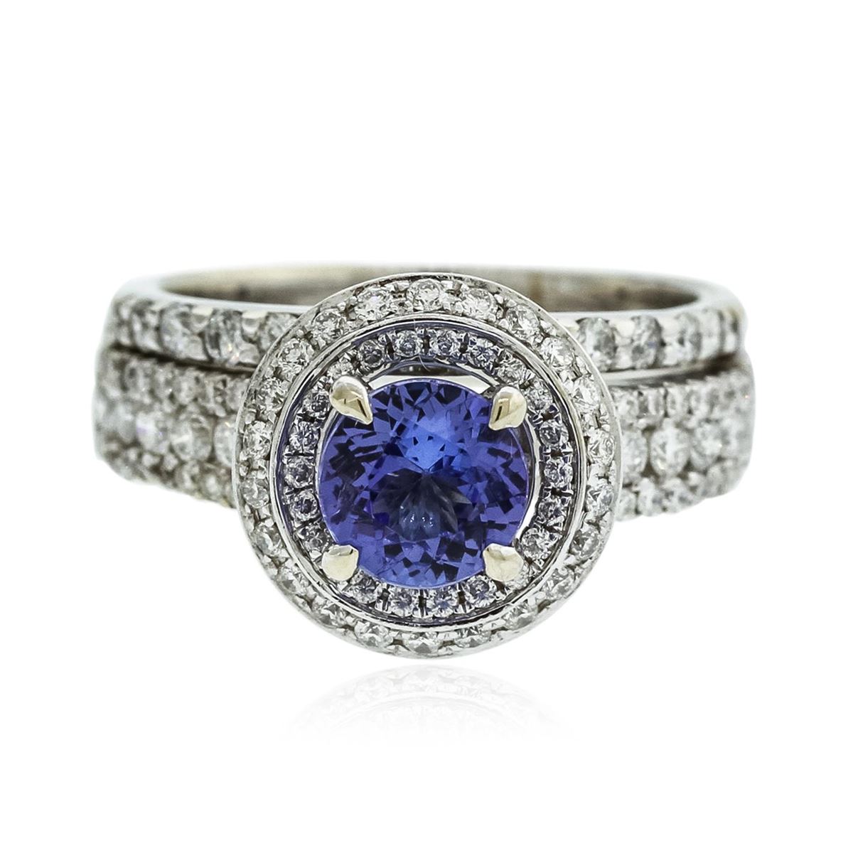 One electronically tested 14KT white gold Ladies combination cast & assembled engagement ring with a bright polish finish. Condition is new. Containing: One prong set round modified mixed cut natural tanzanite, measuring 6.10 - 6.10 x 3.13 mm, approximate weight of 0.78ct., clarity is eye clean, type I, medium light, very slightly grayish, violet color, (GIA V 4/3), cut is very good. Colored gemstones are presumed to have been subjected to commonly used color/clarity enhancement processes. One Hundred Seventeen prong set round brilliant cut diamonds, measuring 1.50 - 1.10 x 0.78mm (depth est.) approximate. Total Weight of 117 Stones = 0.80ct. Clarity: SI-1 to I-1. Color: H - I, Cut is Good. Total Weight of Colored Stones 0.78ct. Total Weight of Diamonds 0.80ct. Total Weight of Ring 7.60 grams. GGL Appraised at $6,065.00.