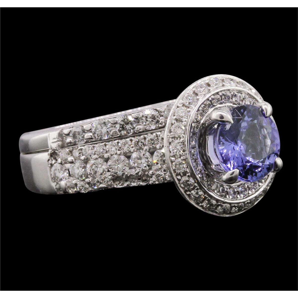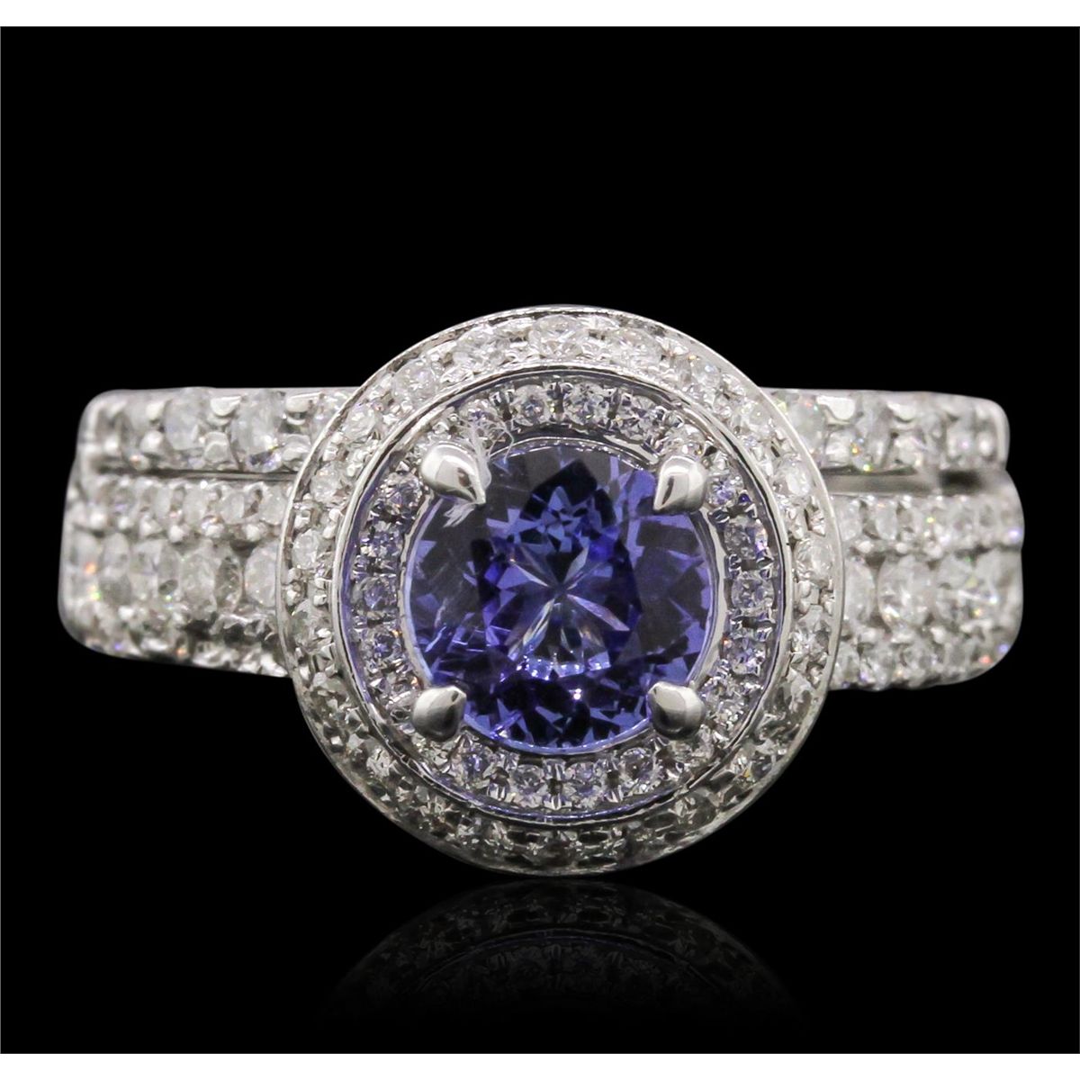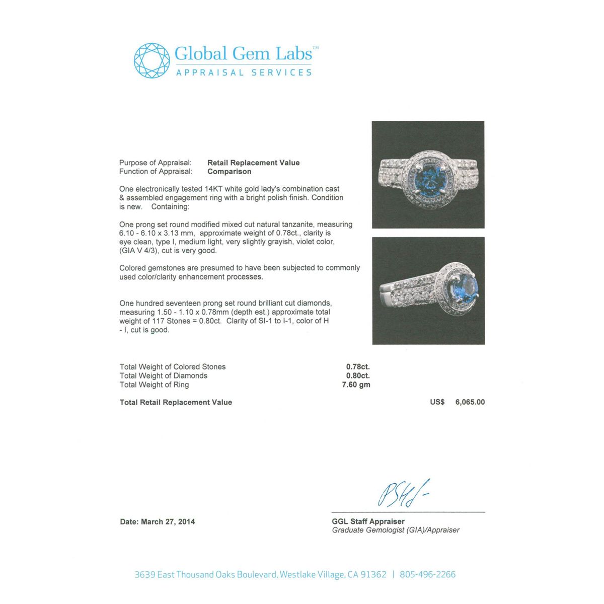 One electronically tested 14KT white gold Ladies combination cast & assembled engagement ring with a bright polish finish. Condition is new. Containing: One prong set round modified mixed cut natural tanzanite, measuring 6.10 - 6.10 x 3.13 mm, approximate weight of 0.78ct., clarity is eye clean, type I, medium light, very slightly grayish, violet color, (GIA V 4/3), cut is very good. Colored gemstones are presumed to have been subjected to commonly used color/clarity enhancement processes. One Hundred Seventeen prong set round brilliant cut diamonds, measuring 1.50 - 1.10 x 0.78mm (depth est.) approximate. Total Weight of 117 Stones = 0.80ct. Clarity: SI-1 to I-1. Color: H - I, Cut is Good. Total Weight of Colored Stones 0.78ct. Total Weight of Diamonds 0.80ct. Total Weight of Ring 7.60 grams. GGL Appraised at $6,065.00.