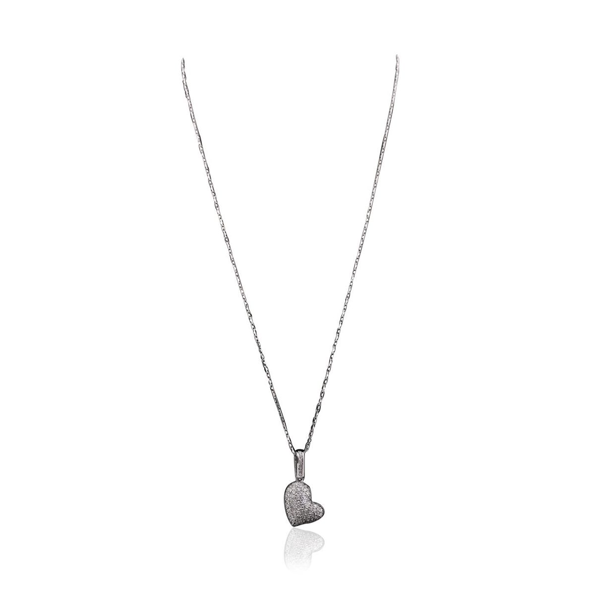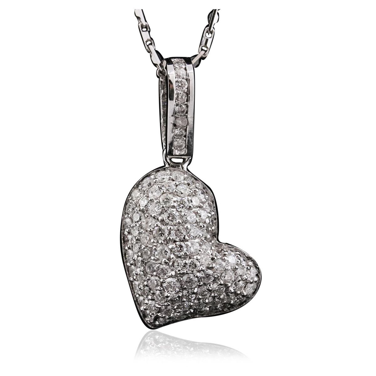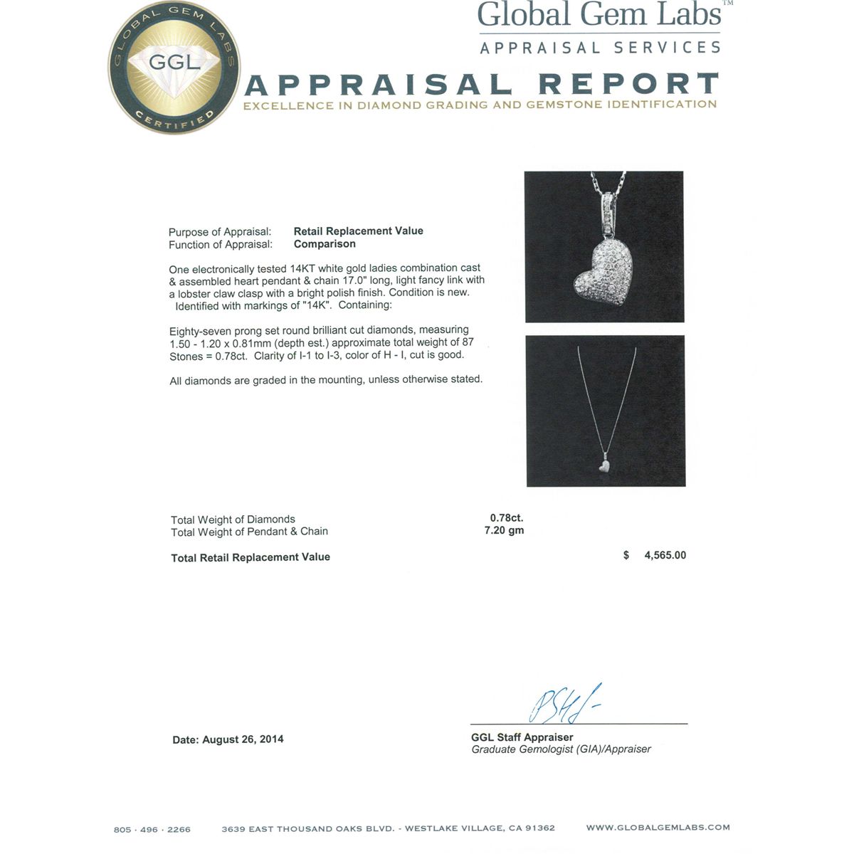 One electronically tested 14KT white gold ladies combination cast & assembled heart pendant & chain 17.0" long, light fancy link with a lobster claw clasp with a bright polish finish. Identified with markings of "14K". Condition is new. Containing: Eighty-Seven prong set round brilliant cut diamonds, measuring 1.50 - 1.20 x 0.81mm (depth est.) approximate total weight of 87 Stones = 0.78ct. Clarity: I-1 to I-3. Color: H - I, Cut is Good. All diamonds are graded in the mounting, unless otherwise stated. Total Weight of Diamonds 0.78ct. Total Weight of Pendant & Chain 7.20 grams. GGL Appraised at $4,565.00.