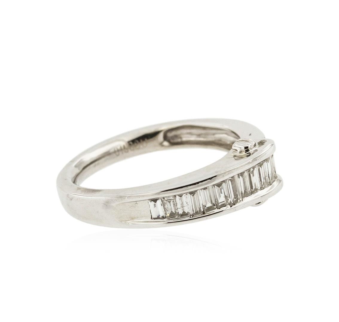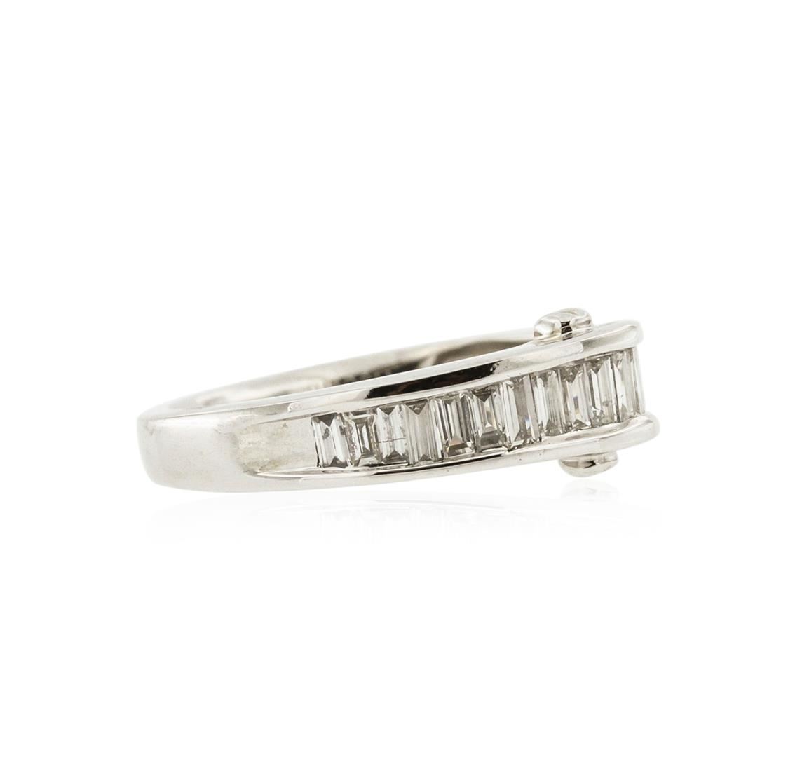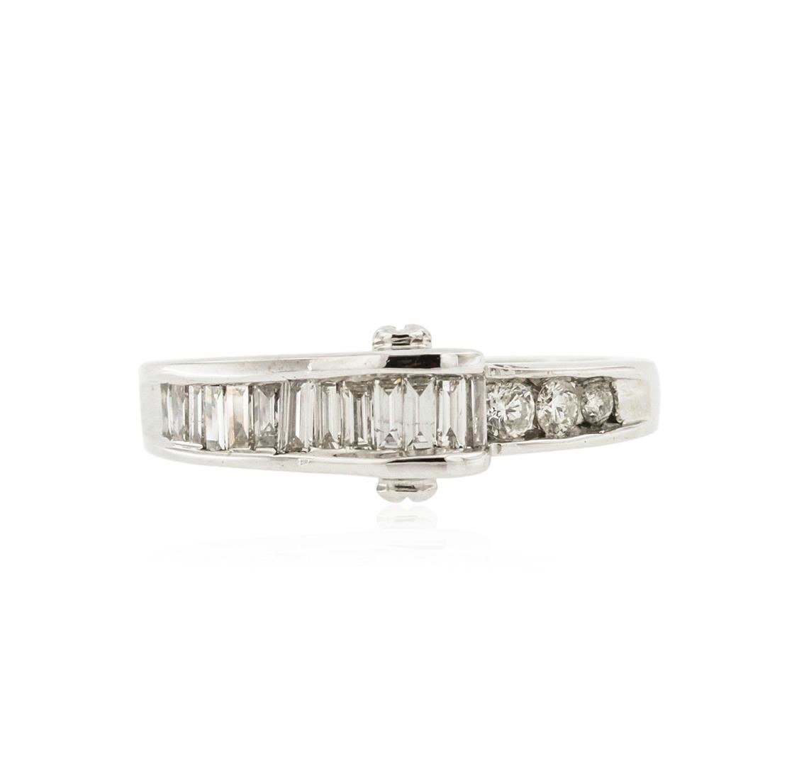 One electronically tested 14KT white gold ladies cast diamond ring with a bright polish finish. Identified with markings of "14K". Condition is new. Containing: Fourteen channel set baguette cut diamonds, measuring from 2.50 x 1.50 x 1.28mm (depth est.) to 3.00 x 1.50 x 1.28mm (depth est.) approximate total weight of 14 Stones = 0.68ct. Clarity: SI-1 to I-1. Color: I - J. Three channel set round brilliant cut diamonds, measuring 2.50 - 1.80 x 1.29mm (depth est.) approximate total weight of 3 Stones = 0.11ct. Clarity: SI-1 to SI-2. Color: I - J. All diamonds are graded in the mounting, unless otherwise stated. Total Weight of Diamonds 0.79ct. Total Weight of Ring 5.30 grams. GGL Appraised at $3,125.00.