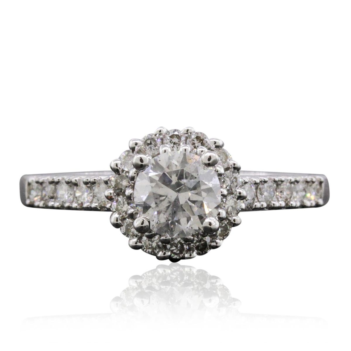 One electronically tested 14KT white gold ladies combination cast & assembled engagement ring with a flat shank with a bright polish finish. Identified with markings of "14K". Condition is new. Containing: One prong set round brilliant cut diamond, measuring 5.41 - 5.40 x 3.08mm (depth est.) approximate weight of 0.55ct. Clarity: I-1. Color: I, Cut is Good. Twenty-Four prong set round brilliant cut diamonds, measuring 1.50 - 1.30 x 0.84mm (depth est.) approximate total weight of 24 Stones = 0.24ct. Clarity: SI-2 to I-1. Color: J - K, Cut is Good. All diamonds are graded in the mounting, unless otherwise stated. Total Weight of Diamonds 0.79ct. Total Weight of Ring 3.20 grams. GGL Appraised at $5,510.00.