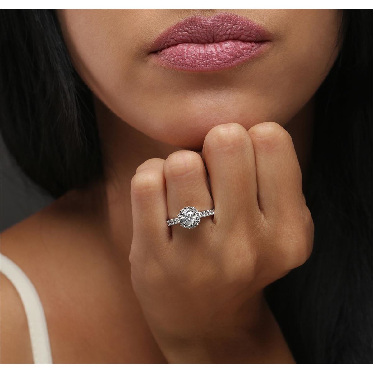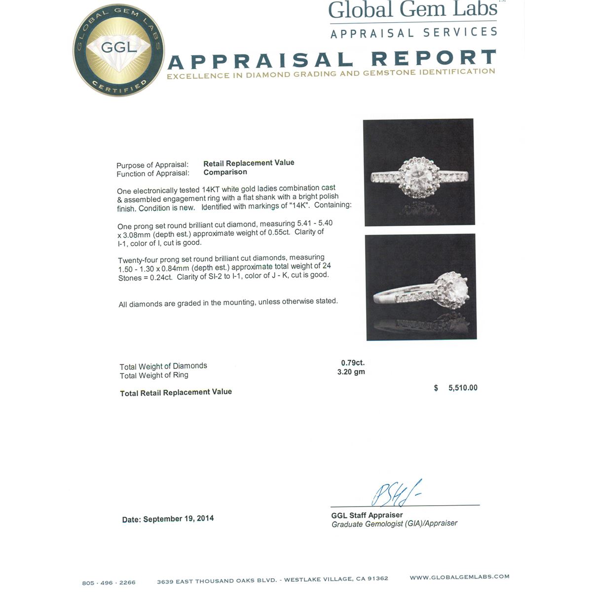 One electronically tested 14KT white gold ladies combination cast & assembled engagement ring with a flat shank with a bright polish finish. Identified with markings of "14K". Condition is new. Containing: One prong set round brilliant cut diamond, measuring 5.41 - 5.40 x 3.08mm (depth est.) approximate weight of 0.55ct. Clarity: I-1. Color: I, Cut is Good. Twenty-Four prong set round brilliant cut diamonds, measuring 1.50 - 1.30 x 0.84mm (depth est.) approximate total weight of 24 Stones = 0.24ct. Clarity: SI-2 to I-1. Color: J - K, Cut is Good. All diamonds are graded in the mounting, unless otherwise stated. Total Weight of Diamonds 0.79ct. Total Weight of Ring 3.20 grams. GGL Appraised at $5,510.00.