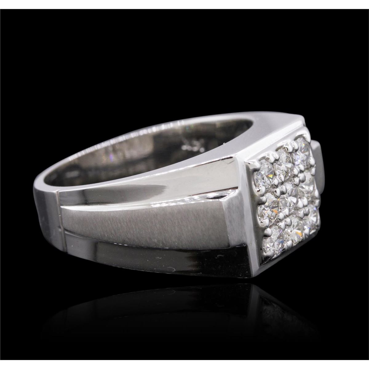 One electronically tested 14KT white gold men's combination cast & assembled diamond ring with a bright polish finish. Identified with markings of "14K". Condition is new. Containing: Nine prong set round brilliant cut diamonds, measuring 2.90 - 2.90 x 1.74mm (depth est.) approximate total weight of 9 Stones = 0.80ct. Clarity: SI-1 to SI-2. Color: I - J, Cut is Good. All diamonds are graded in the mounting, unless otherwise stated. Total Weight of Diamonds 0.80ct. Total Weight of Ring 12.80 grams. GGL Appraised at $5,425.00.