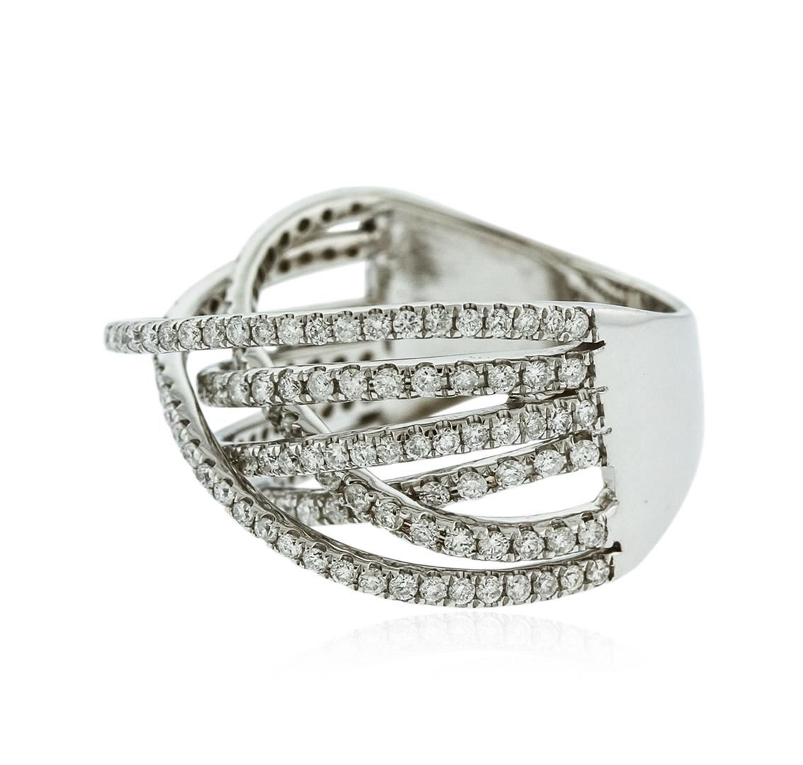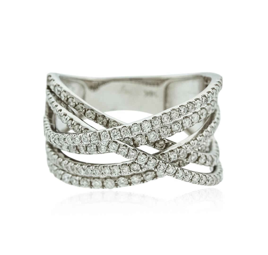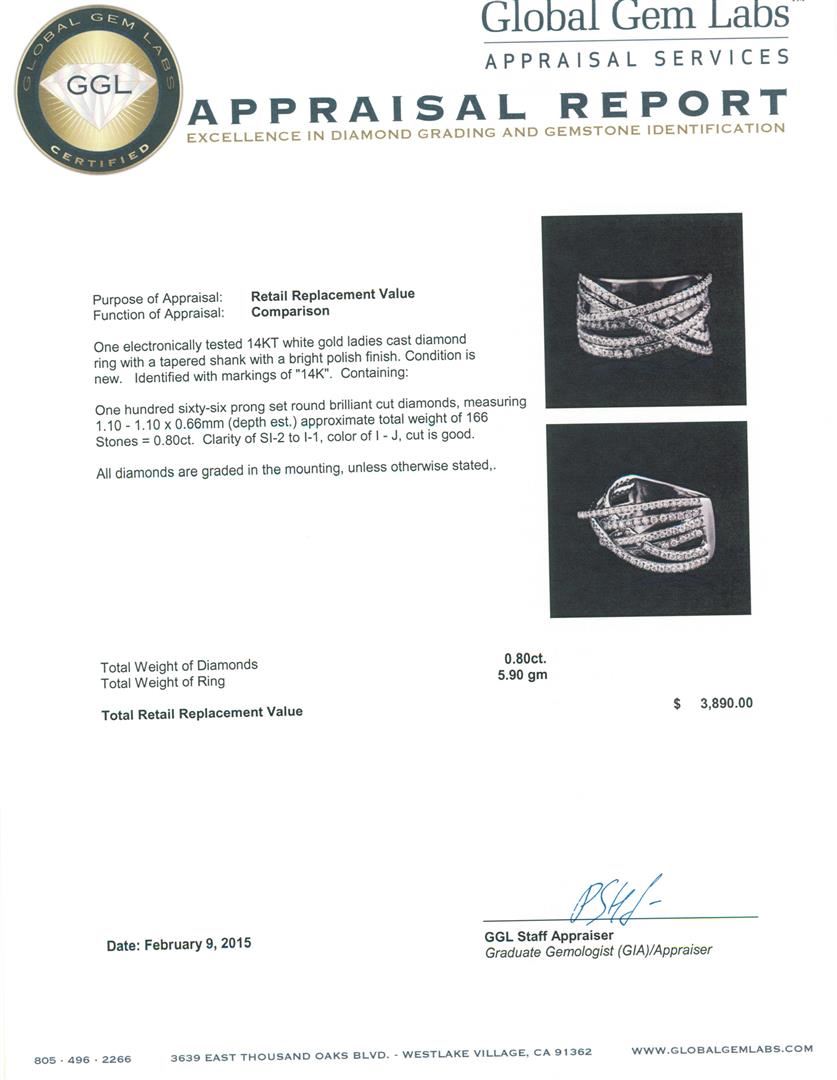 One electronically tested 14KT white gold ladies cast diamond ring with a tapered shank with a bright polish finish. Identified with markings of "14K". Condition is new. Containing: One Hundred Sixty-Six prong set round brilliant cut diamonds, measuring 1.10 - 1.10 x 0.66mm (depth est.) approximate total weight of 166 Stones = 0.80ct. Clarity: SI-2 to I-1. Color: I - J, Cut is Good. All diamonds are graded in the mounting, unless otherwise stated,. Total Weight of Diamonds 0.80ct. Total Weight of Ring 5.90 grams. GGL Appraised at $3,890.00.