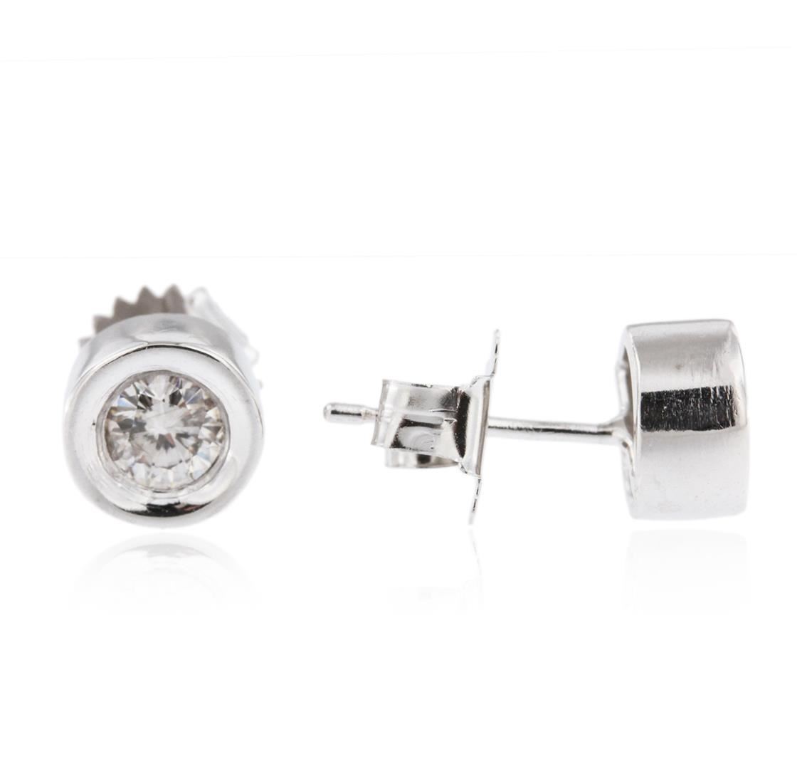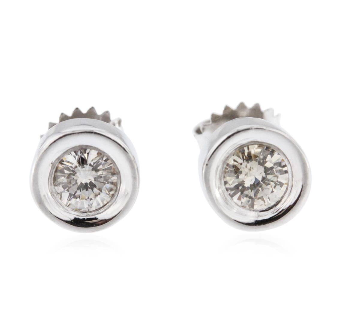 One pair of stud earrings featuring: 14KT white gold weighing 2.84 grams containing two bezel set round diamonds with a total weight of 0.80ct.