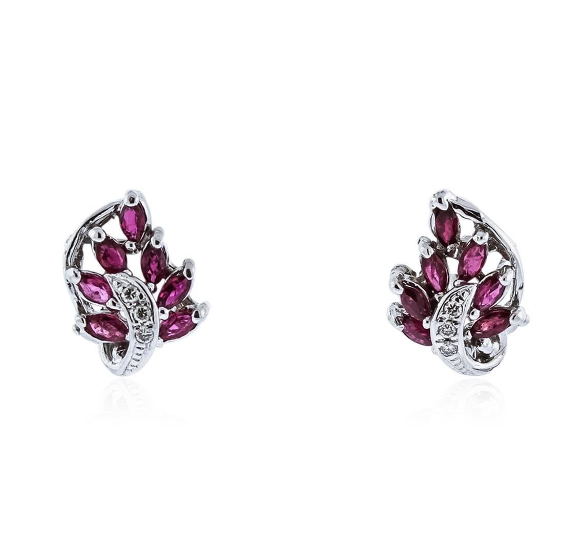 One pair of earrings featuring: 14KT white gold weighing 4.80 grams containing rubies with a total weight of 0.80ct and pave set round diamonds with a total weight of 0.06ct.