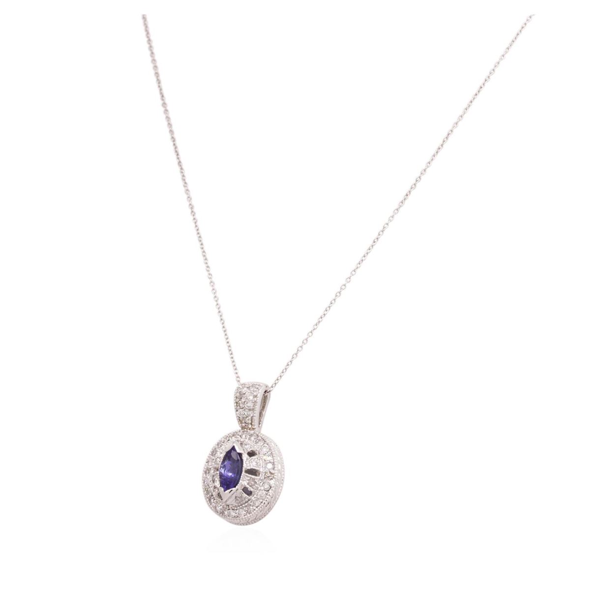 One pendant with chain featuring: 14KT white gold weighing 4.67 grams containing one sapphire with a total weight of 0.80ct and round diamonds with a total weight of 0.52cts.