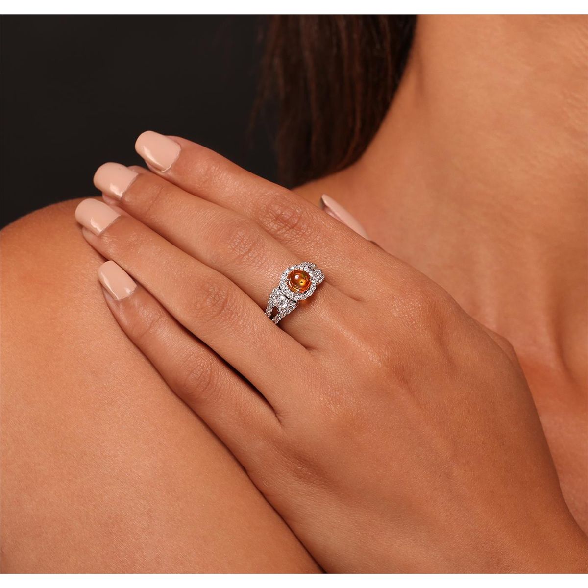 One electronically tested 14KT white gold Ladies combination cast & assembled ring with a bright polish finish. Condition is new. Identified with markings of "14K". Containing: Two prong set round brilliant cut diamonds, measuring 3.70 - 3.70 x 3.70mm (depth est.) approximate. Total Weight of 2 Stones = 0.62ct. Clarity: I-1. Color: J, Cut is Good. Thirty prong set round brilliant cut diamonds, measuring 1.90 - 1.90 x 1.14mm (depth est.) approximate. Total Weight of 30 Stones = 0.92ct. Clarity: I-1 to I-2. Color: I - J, Cut is Good. One fire opal that is cut in a round shaped cabochon and is prong set, measuring 8.00 mm long x 8.00 mm wide, and 4.00 mm thick and the exact weight is 0.80 carats. The opal has a bright, play of color (fire) in a pattern; a high dome; a good cut; no inclusions; consistent in its brightness and pattern; and is not directional. Total Weight of Diamonds 1.54ct. Total Weight of Opals 0.80ct. Total Weight of Ring 5.00 grams. GGL Appraised at $5,420.00.