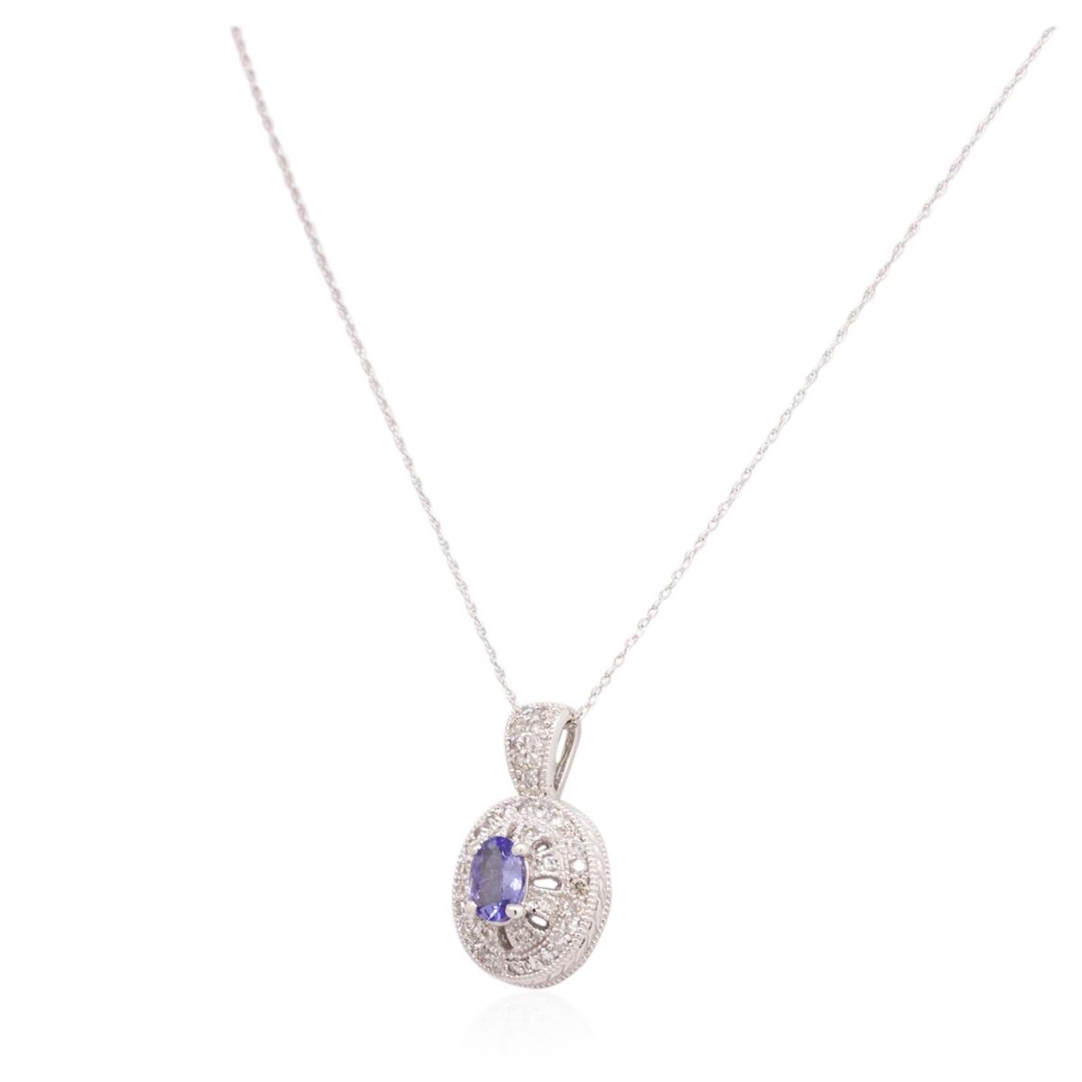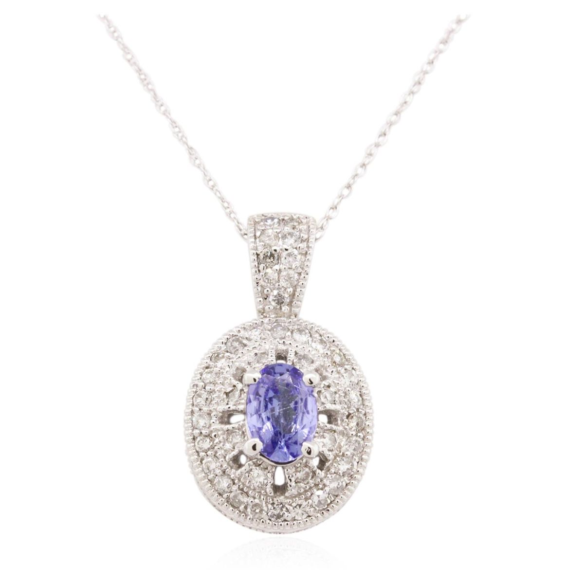 One pendant with chain featuring: 14KT white gold weighing 4.67 grams containing one sapphire with a total weight of 0.80ct and round diamonds with a total weight of 0.52cts.