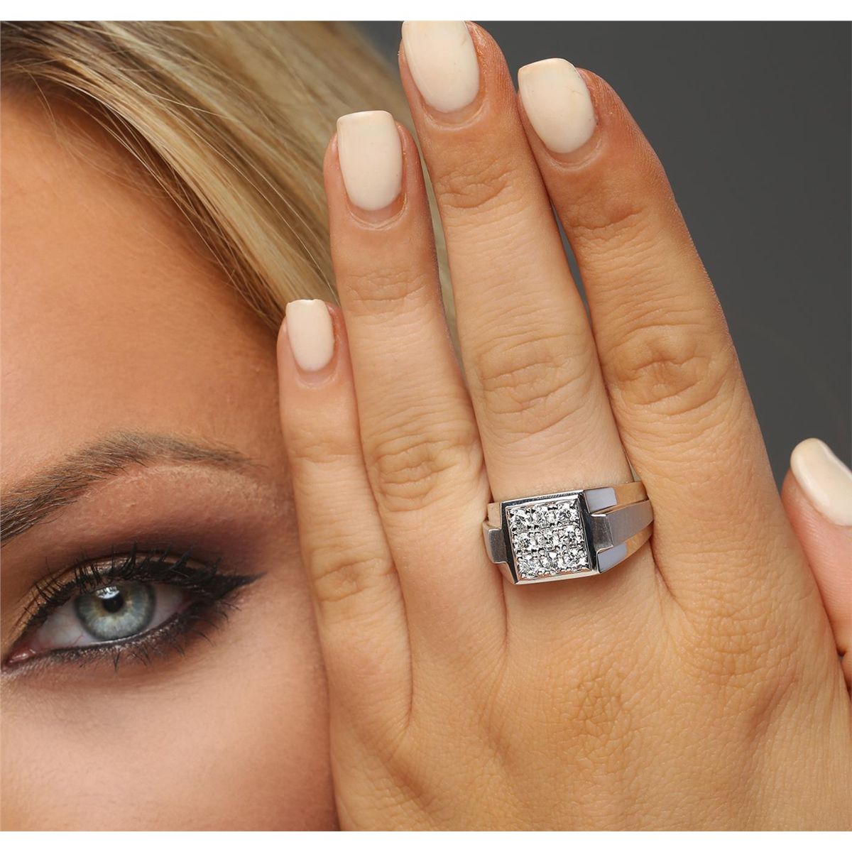 One electronically tested 14KT white gold men's combination cast & assembled diamond ring with a bright polish finish. Identified with markings of "14K". Condition is new. Containing: Nine prong set round brilliant cut diamonds, measuring 2.90 - 2.90 x 1.74mm (depth est.) approximate total weight of 9 Stones = 0.80ct. Clarity: SI-1 to SI-2. Color: I - J, Cut is Good. All diamonds are graded in the mounting, unless otherwise stated. Total Weight of Diamonds 0.80ct. Total Weight of Ring 12.80 grams. GGL Appraised at $5,425.00.