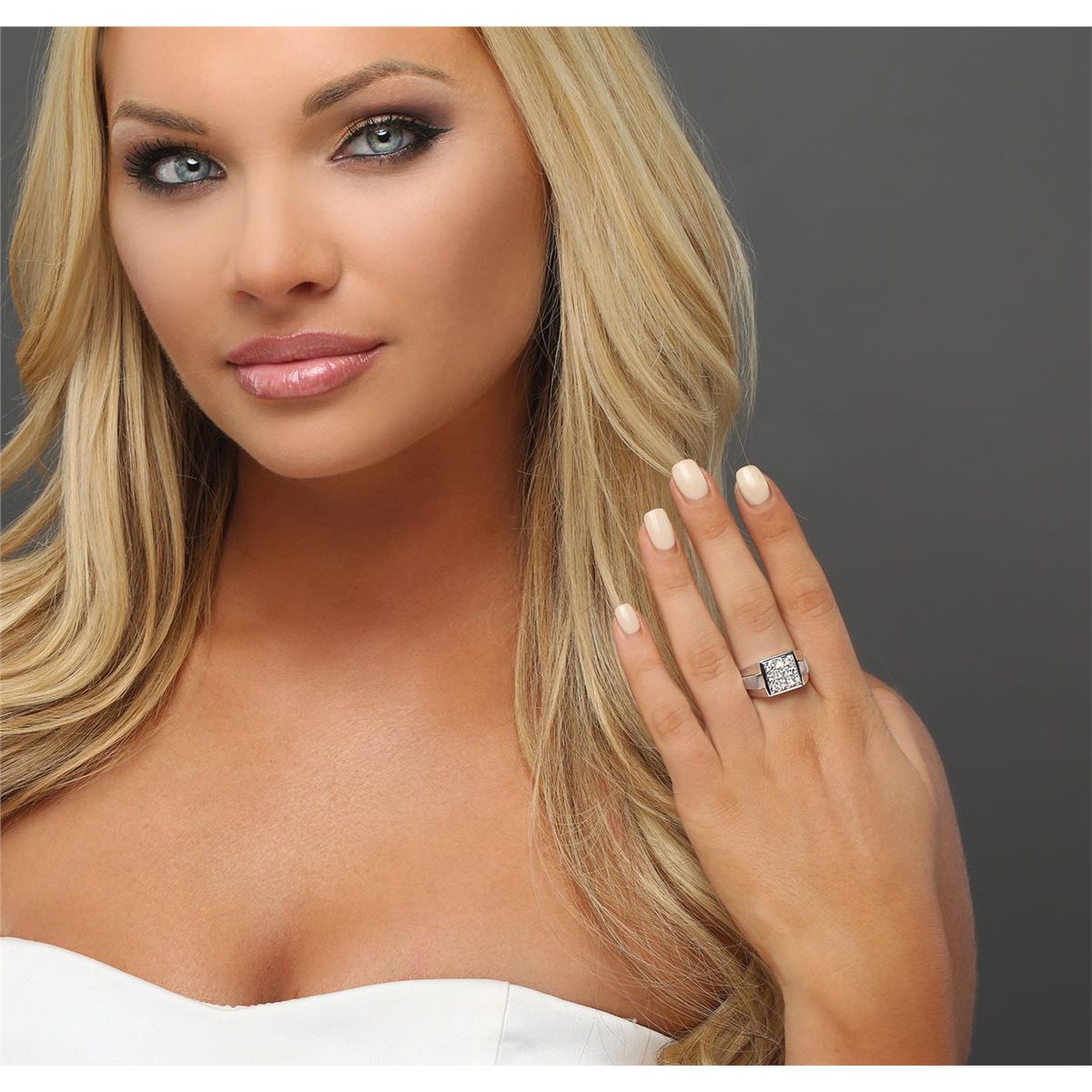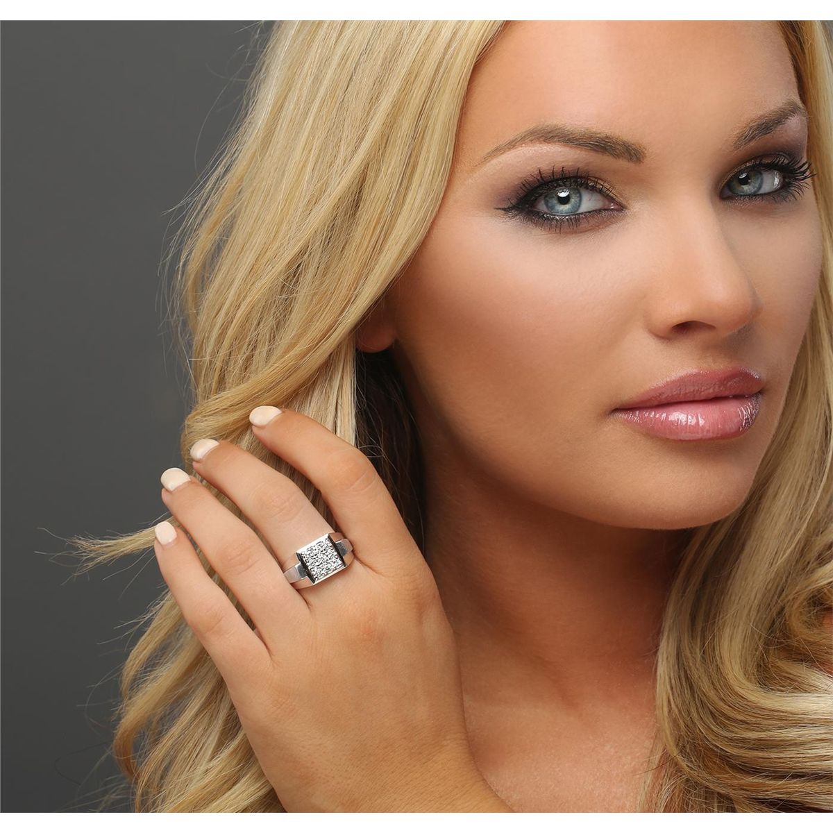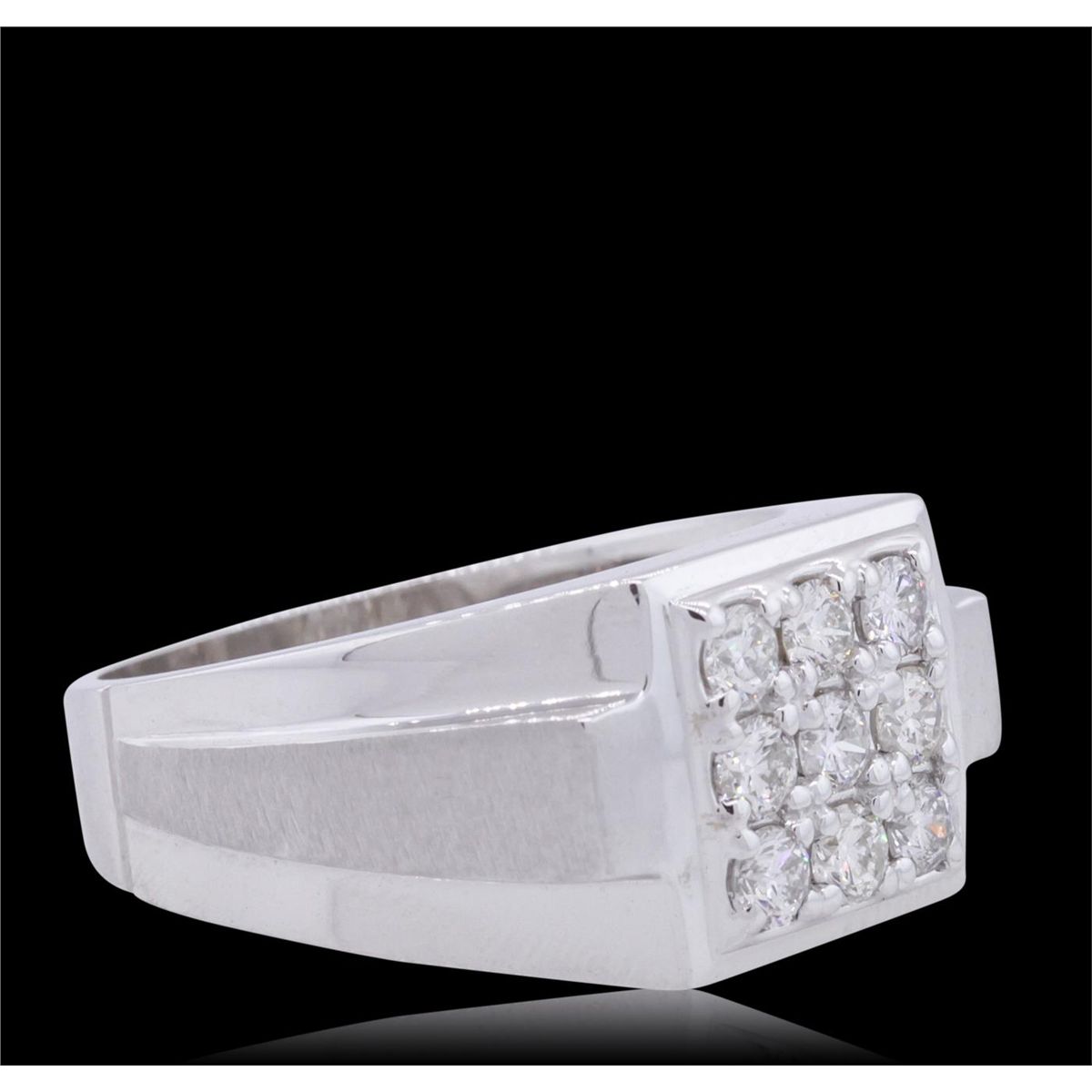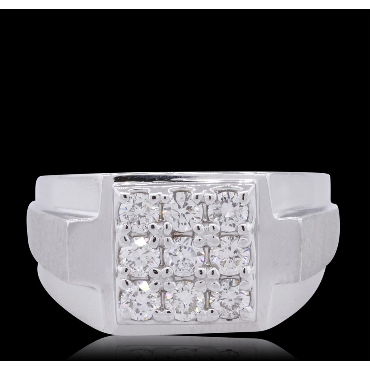 One electronically tested 14KT white gold men's combination cast & assembled diamond ring with a bright polish finish. Identified with markings of "14K". Condition is new. Containing: Nine prong set round brilliant cut diamonds, measuring 2.90 - 2.90 x 1.74mm (depth est.) approximate total weight of 9 Stones = 0.80ct. Clarity: SI-1 to SI-2. Color: I - J, Cut is Good. All diamonds are graded in the mounting, unless otherwise stated. Total Weight of Diamonds 0.80ct. Total Weight of Ring 12.80 grams. GGL Appraised at $5,425.00.