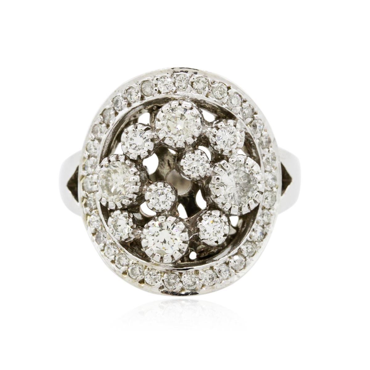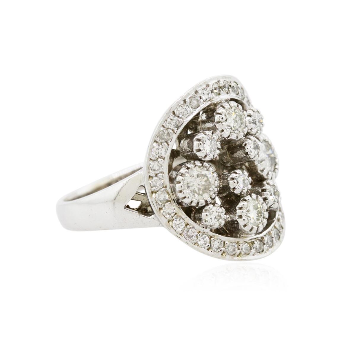 One electronically tested 14KT white gold ladies combination cast & assembled ring with a bright polish finish. Condition is new. Identified with markings of "14K". Containing: Thirty-Four prong set round brilliant cut diamonds, measuring 1.20 - 1.20 x 0.72mm (depth est.) approximate. Total Weight of 34 Stones = 0.21ct. Clarity: I-1 to I-2. Color: I - J, Cut is Good. Six gypsy set round brilliant cut diamonds, measuring 1.60 - 1.60 x 0.96mm (depth est.) approximate. Total Weight of 6 Stones = 0.09ct. Clarity: SI-1 to SI-2. Color: I - J, Cut is Good. Four gypsy set round brilliant cut diamonds, measuring 3.50 - 3.00 x 1.95mm (depth est.) approximate. Total Weight of 4 Stones = 0.50ct. Clarity: I-1 to I-2. Color: I - J, Cut is Good. All diamonds are graded in the mounting, unless otherwise stated. Total Weight of Diamonds 0.81ct. Total Weight of Ring 7.30 grams. GGL Appraised at $4,200.00.
