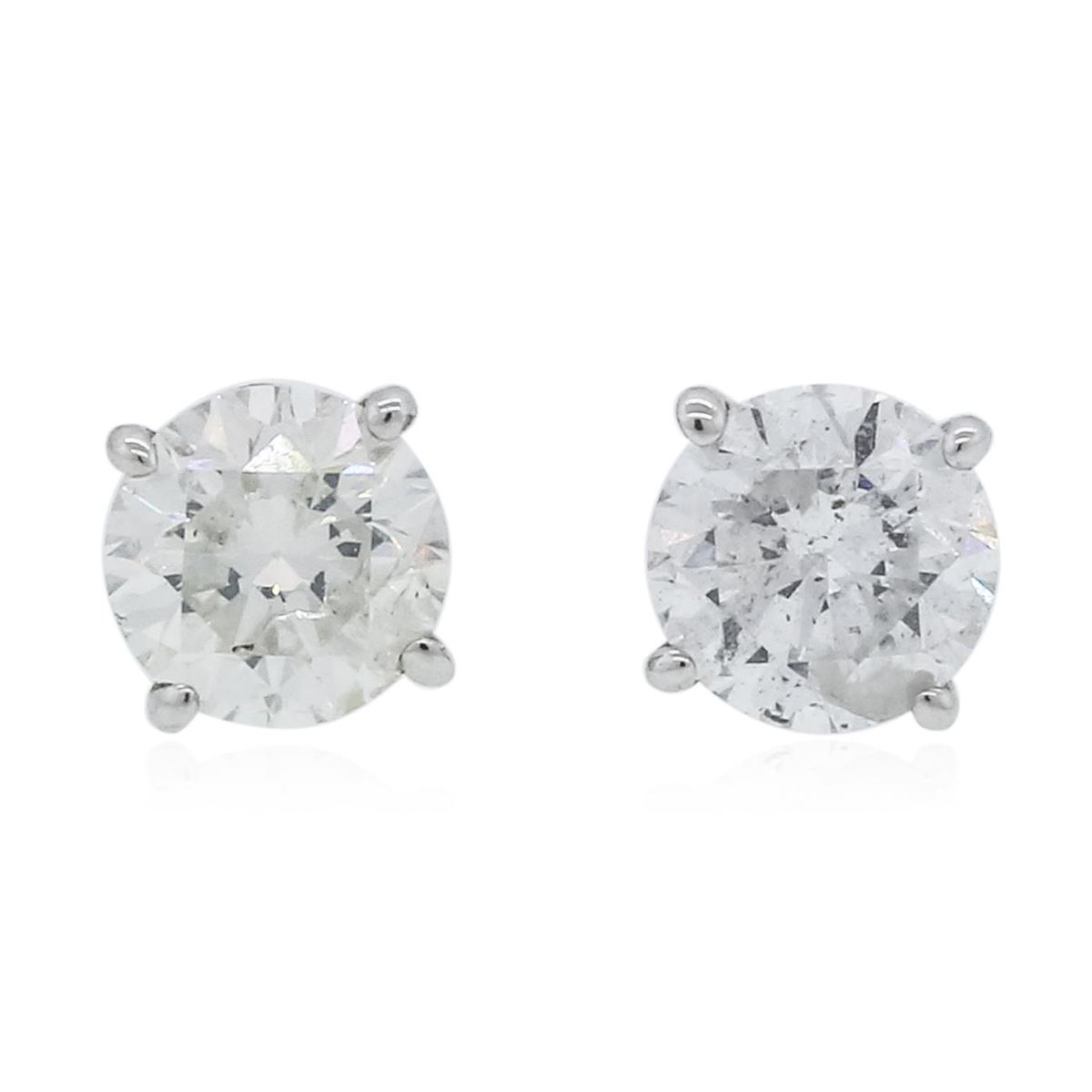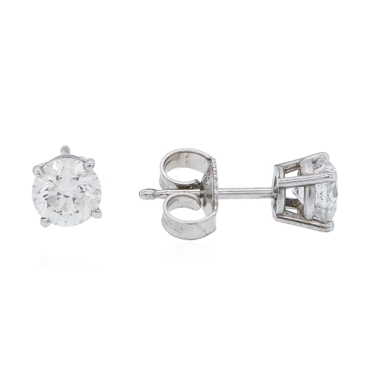 One pair electronically tested 14KT white gold ladies cast diamond stud earrings with friction posts with a bright polish finish. Identified with markings of "14K". Condition is new. Containing: One prong set round brilliant cut diamond, measuring 4.80 - 4.80 x 2.88mm (depth est.) approximate weight of 0.41ct. Clarity: I-1. Color: J, Cut is Good. One prong set round brilliant cut diamond, measuring 4.80 - 4.80 x 2.88mm (depth est.) approximate weight of 0.41ct. Clarity: I-1. Color: J, Cut is Good. All diamonds are graded in the mounting, unless otherwise stated. Total Weight of Diamonds 0.81ct. Total Weight of Earrings 1.00 grams. GGL Appraised at $2,890.00.