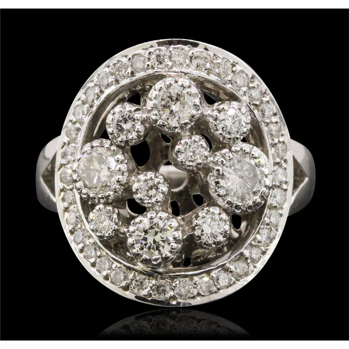 One electronically tested 14KT white gold ladies combination cast & assembled ring with a bright polish finish. Condition is new. Identified with markings of "14K". Containing: Thirty-Four prong set round brilliant cut diamonds, measuring 1.20 - 1.20 x 0.72mm (depth est.) approximate. Total Weight of 34 Stones = 0.21ct. Clarity: I-1 to I-2. Color: I - J, Cut is Good. Six gypsy set round brilliant cut diamonds, measuring 1.60 - 1.60 x 0.96mm (depth est.) approximate. Total Weight of 6 Stones = 0.09ct. Clarity: SI-1 to SI-2. Color: I - J, Cut is Good. Four gypsy set round brilliant cut diamonds, measuring 3.50 - 3.00 x 1.95mm (depth est.) approximate. Total Weight of 4 Stones = 0.50ct. Clarity: I-1 to I-2. Color: I - J, Cut is Good. All diamonds are graded in the mounting, unless otherwise stated. Total Weight of Diamonds 0.81ct. Total Weight of Ring 7.30 grams. GGL Appraised at $4,200.00.