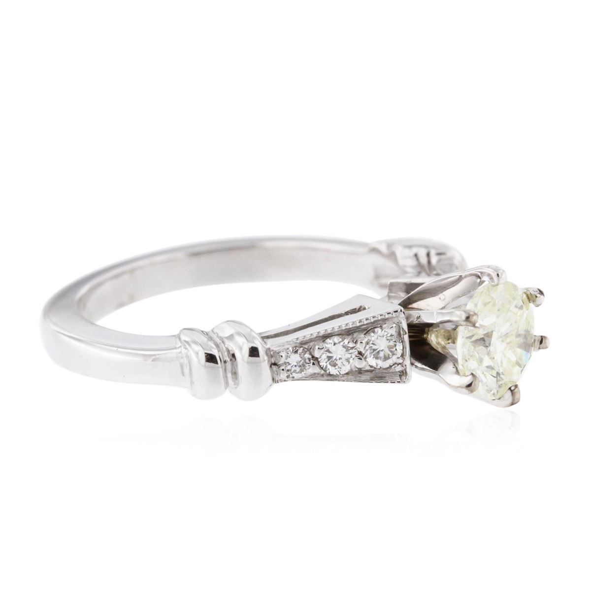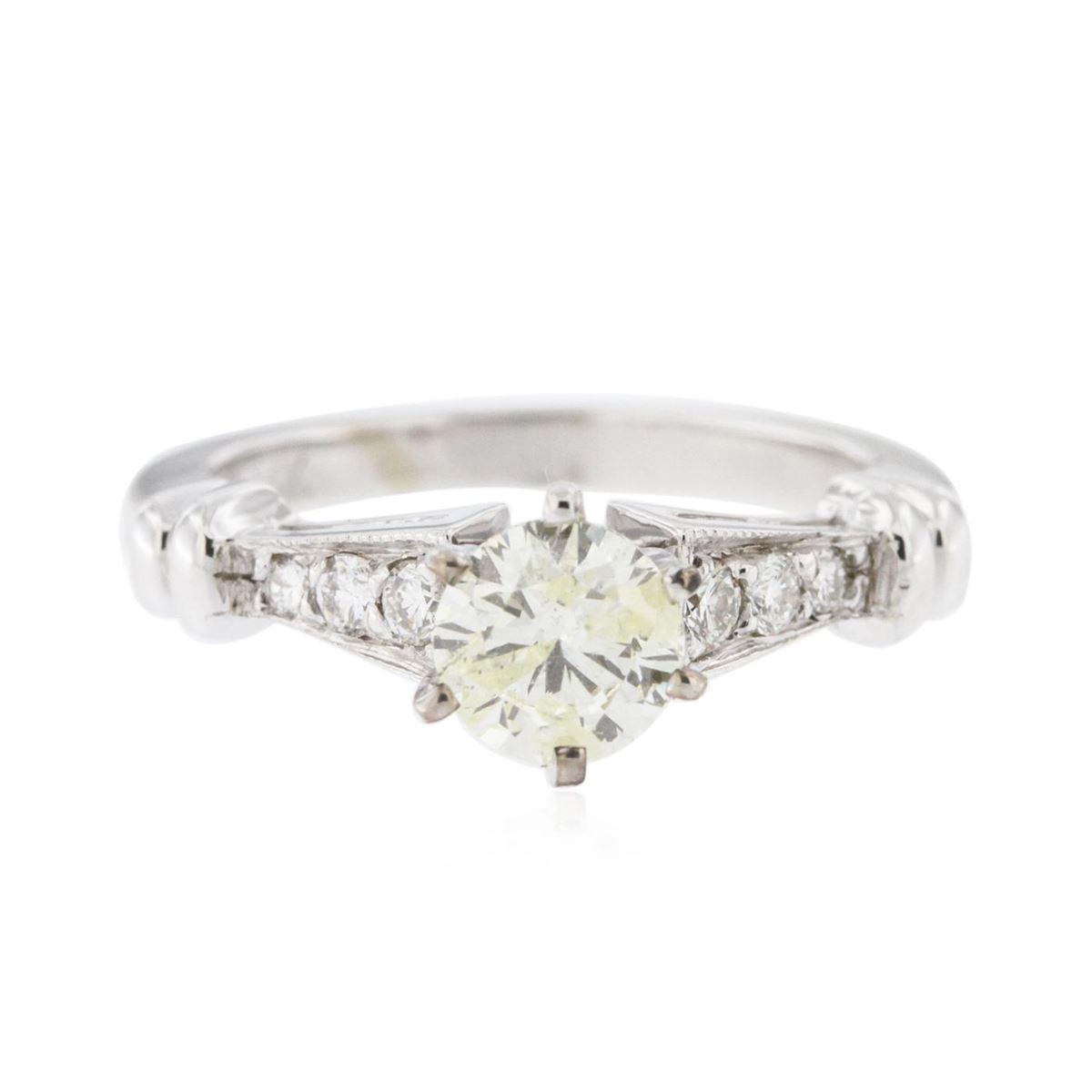 One electronically tested 14KT white gold ladies cast diamond engagement ring with a bright polish finish. Identified with markings of "14K". Condition is new. Containing: One prong set round brilliant cut diamond, measuring 5.80 - 5.80 x 3.48mm (depth est.) approximate weight of 0.71ct. Clarity: I-2. Color: L, Cut is Good. Six prong set round brilliant cut diamonds, measuring 1.80 - 1.50 x 0.99mm (depth est.) approximate total weight of 6 Stones = 0.10ct. Clarity: SI-1. Color: I, Cut is Good. All diamonds are graded in the mounting, unless otherwise stated. Total Weight of Diamonds 0.81ct. Total Weight of Engagement Ring 4.20 grams. GGL Appraised at $3,770.00.