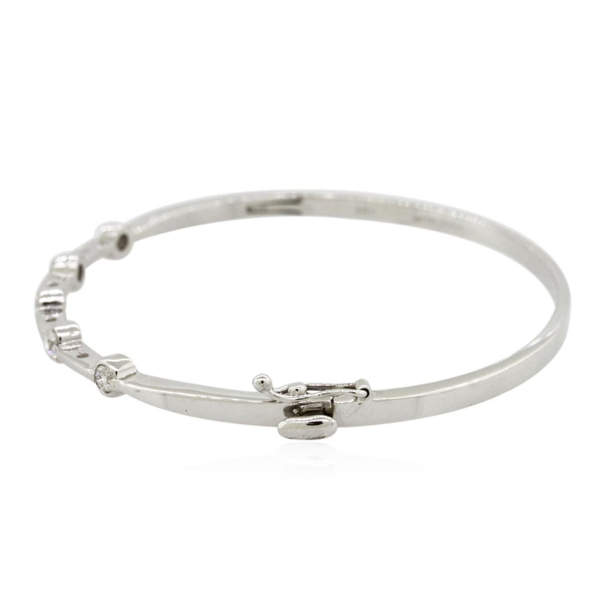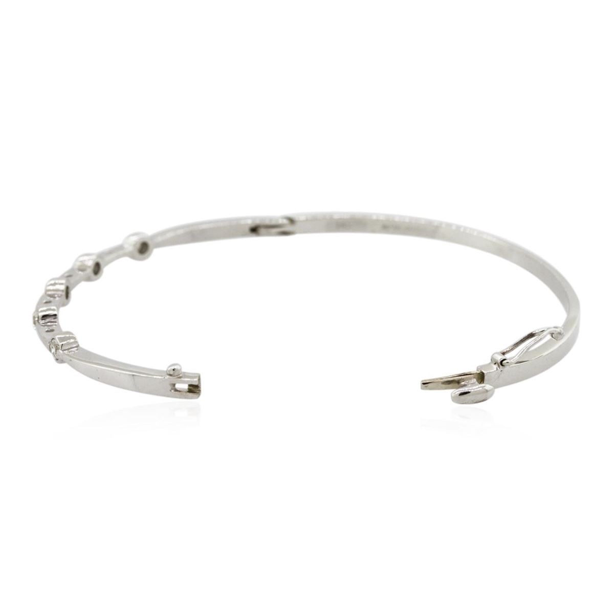 One electronically tested 14KT white gold ladies cast diamond bangle bracelet with a hidden box clasp with safety closer with a bright polish finish. Identified with markings of "14K". Condition is new. Containing: Five bezel set round brilliant cut diamonds, measuring 3.00 - 3.00 x 3.00mm (depth est.) approximate total weight of 5 Stones = 0.82ct. Clarity: SI-2. Color: J - K, Cut is Good. All diamonds are graded in the mounting, unless otherwise stated. Total Weight of Diamonds 0.82ct. Total Weight of Bangle Bracelet 11.30 grams. GGL Appraised at $4,075.00.