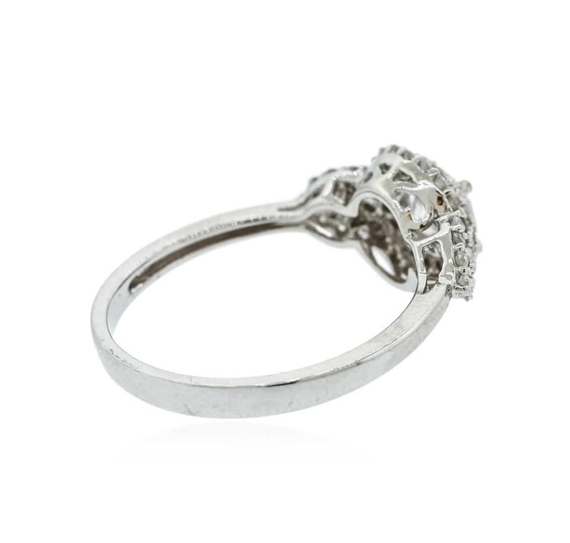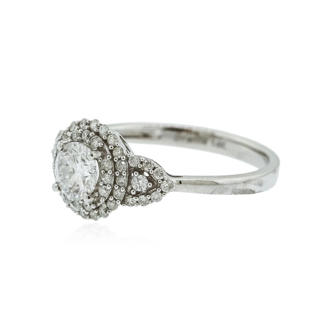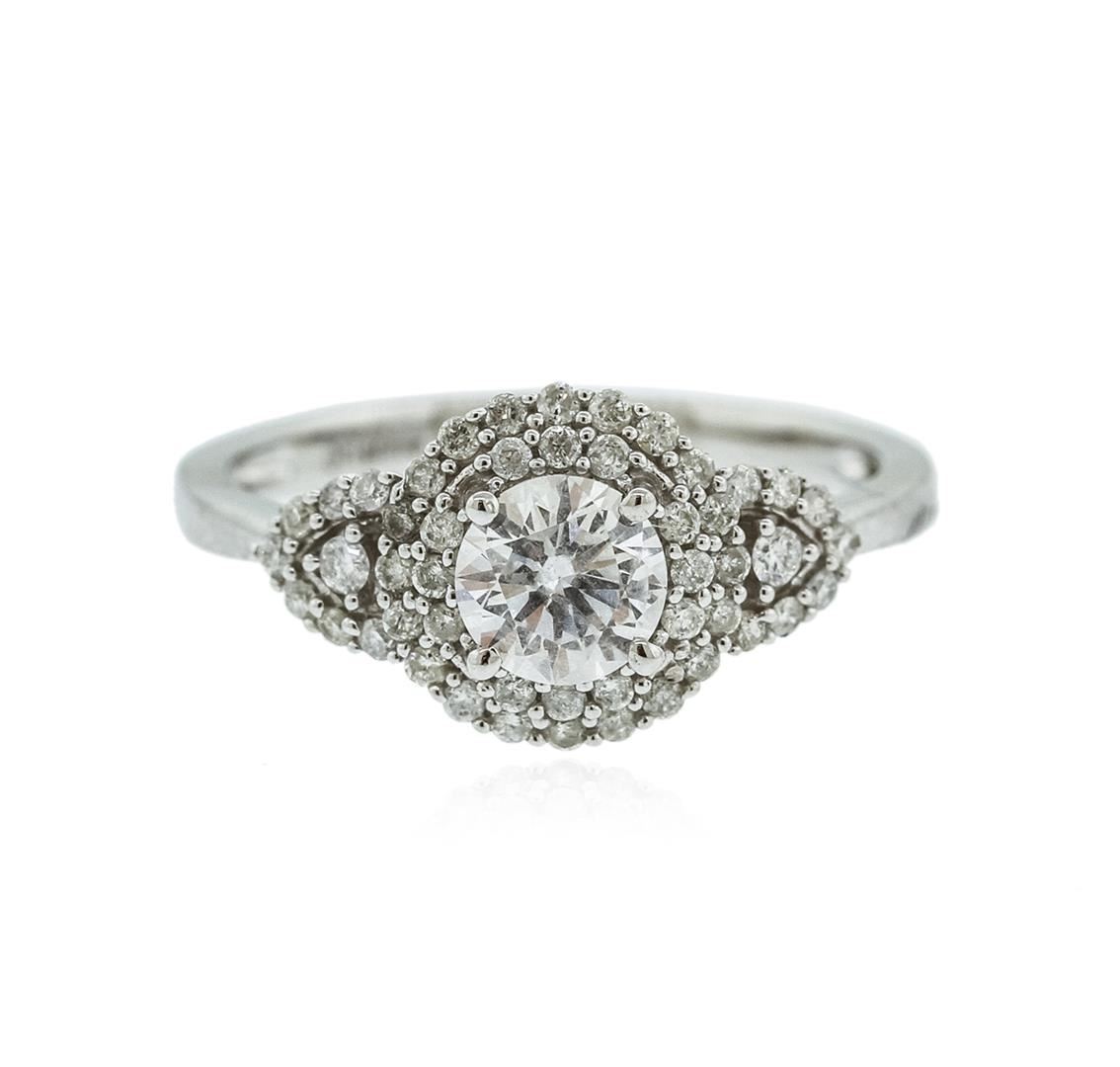 One electronically tested 14KT white gold ladies combination cast & assembled engagement ring with a flat shank with a bright polish finish. Identified with markings of "14K". Condition is new. Containing: One prong set round brilliant cut diamond, measuring 5.40 - 5.30 x 3.26mm (depth est.) approximate weight of 0.57ct. Clarity: I-2. Color: I, Cut is Good. Forty-Eight prong set round brilliant cut diamonds, measuring 1.30 - 1.10 x 0.72mm (depth est.) approximate total weight of 48 Stones = 0.25ct. Clarity: I-1 to I-2. Color: I - J, Cut is Good. All diamonds are graded in the mounting, unless otherwise stated. Total Weight of Diamonds 0.82ct. Total Weight of Ring 2.60 grams. GGL Appraised at $4,025.00.