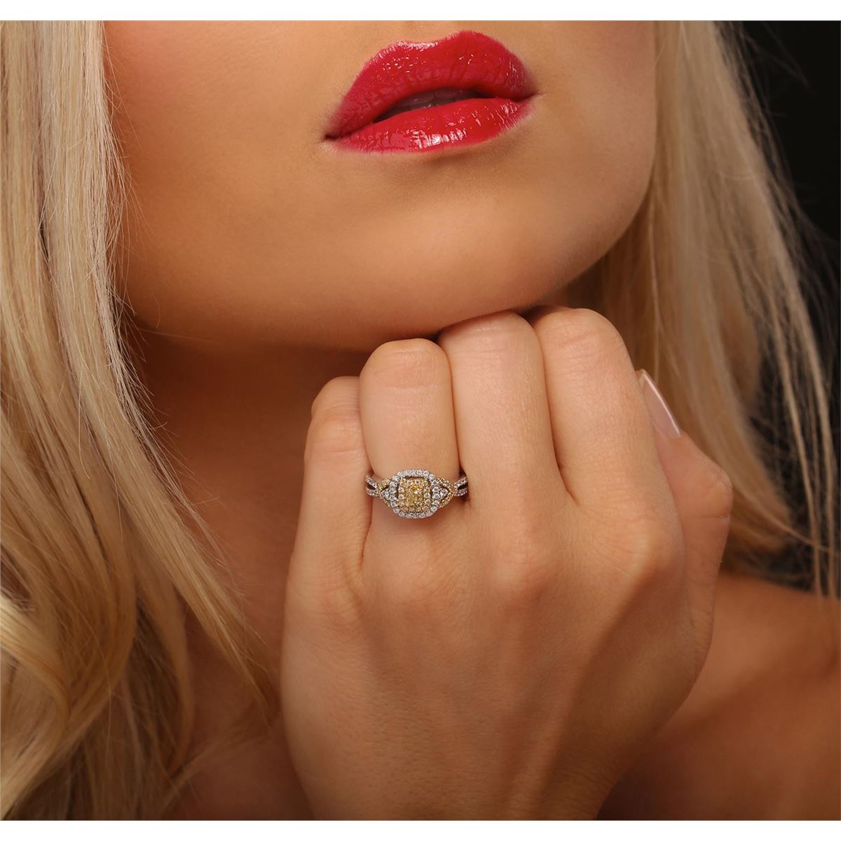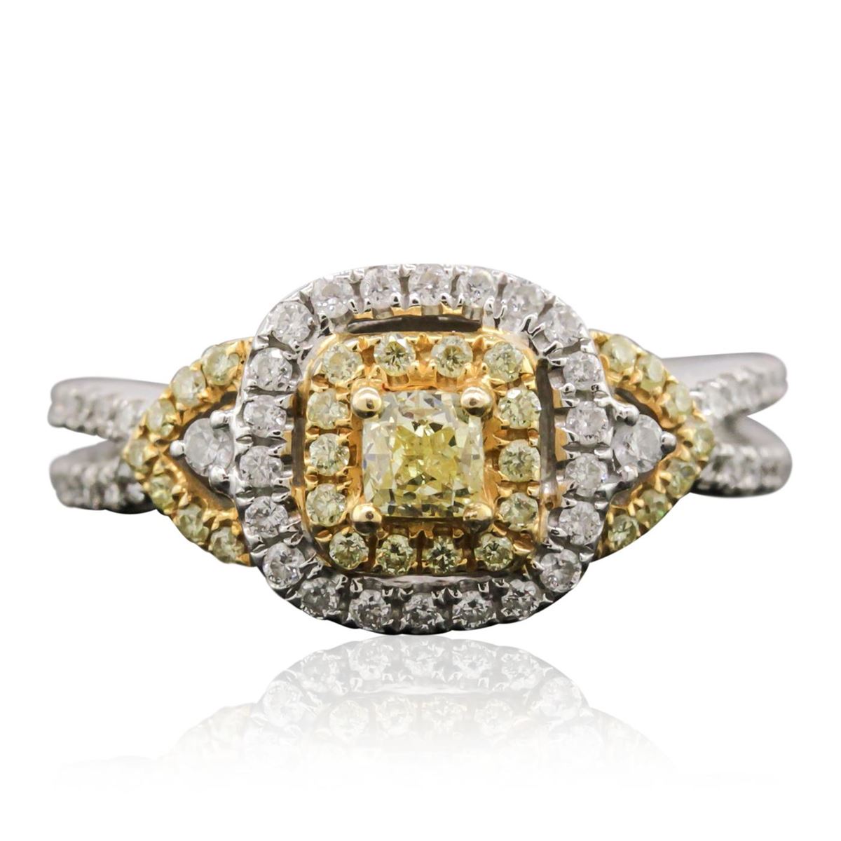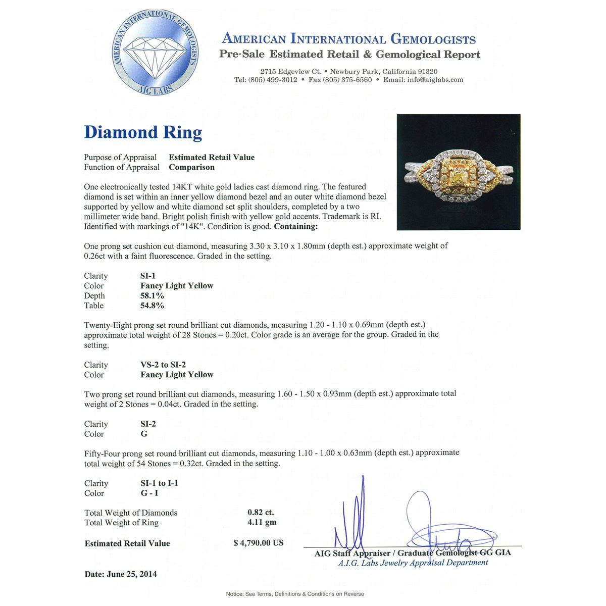 One electronically tested 14KT white gold ladies cast diamond ring. The featured diamond is set within an inner yellow diamond bezel and an outer white diamond bezel supported by yellow and white diamond set split shoulders, completed by a two millimeter wide band. Bright polish finish with yellow gold accents. Trademark is RI. Identified with markings of "14K". Condition is good. Containing: One prong set cushion cut diamond, measuring 3.30 x 3.10 x 1.80mm (depth est.) approximate weight of 0.26ct with a faint fluorescence. Graded in the setting. Clarity SI-1. Depth 58.1%. Table 54.8%. Twenty-Eight prong set round brilliant cut diamonds, measuring 1.20 - 1.10 x 0.69mm (depth est.) approximate total weight of 28 Stones = 0.20ct. Color grade is an average for the group. Graded in the setting. Clarity VS-2 to SI-2. Color fancy light yellow. Two prong set round brilliant cut diamonds, measuring 1.60 - 1.50 x 0.93mm (depth est.) approximate total weight of 2 Stones = 0.04ct. Graded in the setting. Clarity SI-2. Color G. Fifty-Four prong set round brilliant cut diamonds, measuring 1.10 - 1.00 x 0.63mm (depth est.) approximate total weight of 54 Stones = 0.32ct. Graded in the setting. Clarity SI-1 to I-1. Color G - I. Total Weight of Diamonds 0.82 ct. Total Weight of Ring 4.11 grams. AIG Appraised at $4,790.00.