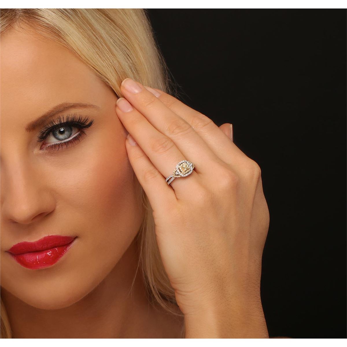 One electronically tested 14KT white gold ladies cast diamond ring. The featured diamond is set within an inner yellow diamond bezel and an outer white diamond bezel supported by yellow and white diamond set split shoulders, completed by a two millimeter wide band. Bright polish finish with yellow gold accents. Trademark is RI. Identified with markings of "14K". Condition is good. Containing: One prong set cushion cut diamond, measuring 3.30 x 3.10 x 1.80mm (depth est.) approximate weight of 0.26ct with a faint fluorescence. Graded in the setting. Clarity SI-1. Depth 58.1%. Table 54.8%. Twenty-Eight prong set round brilliant cut diamonds, measuring 1.20 - 1.10 x 0.69mm (depth est.) approximate total weight of 28 Stones = 0.20ct. Color grade is an average for the group. Graded in the setting. Clarity VS-2 to SI-2. Color fancy light yellow. Two prong set round brilliant cut diamonds, measuring 1.60 - 1.50 x 0.93mm (depth est.) approximate total weight of 2 Stones = 0.04ct. Graded in the setting. Clarity SI-2. Color G. Fifty-Four prong set round brilliant cut diamonds, measuring 1.10 - 1.00 x 0.63mm (depth est.) approximate total weight of 54 Stones = 0.32ct. Graded in the setting. Clarity SI-1 to I-1. Color G - I. Total Weight of Diamonds 0.82 ct. Total Weight of Ring 4.11 grams. AIG Appraised at $4,790.00.