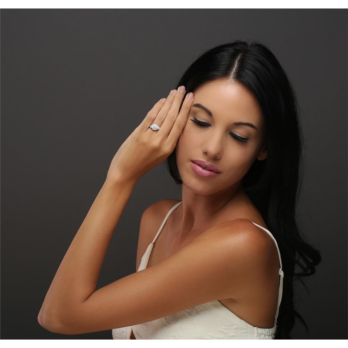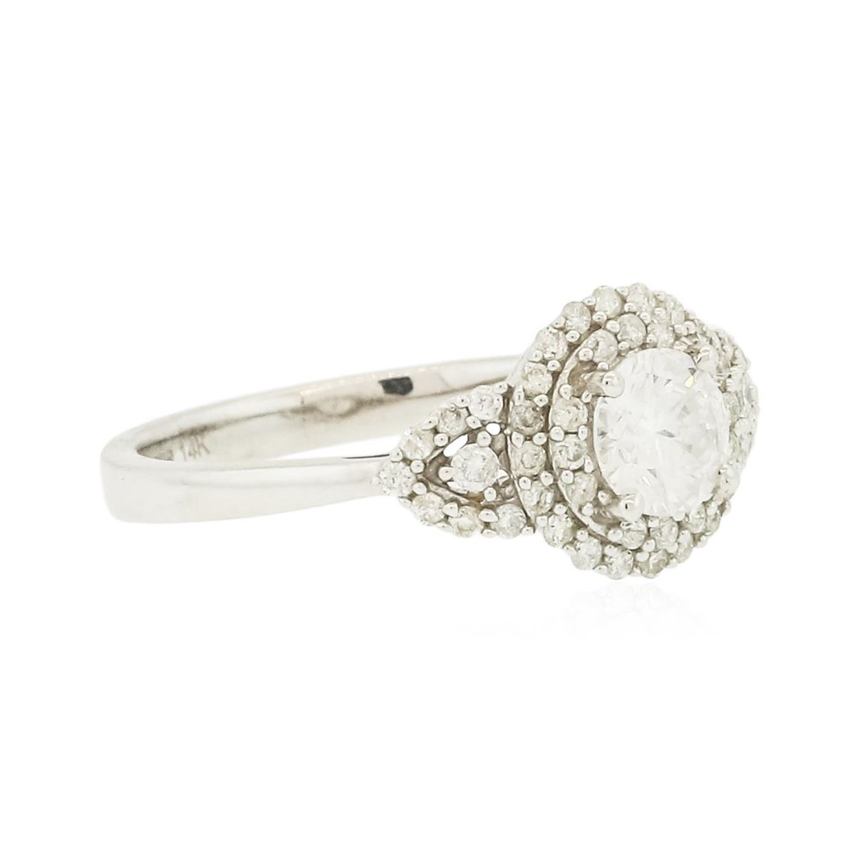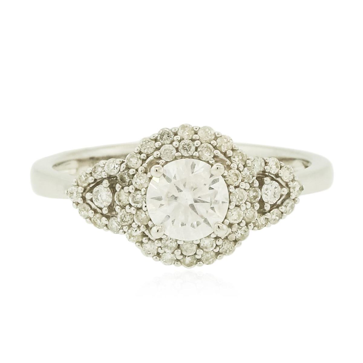 One electronically tested 14KT white gold ladies combination cast & assembled engagement ring with a flat shank with a bright polish finish. Identified with markings of "14K". Condition is new. Containing: One prong set round brilliant cut diamond, measuring 5.40 - 5.30 x 3.26mm (depth est.) approximate weight of 0.57ct. Clarity: I-2. Color: I, Cut is Good. Forty-Eight prong set round brilliant cut diamonds, measuring 1.30 - 1.10 x 0.72mm (depth est.) approximate total weight of 48 Stones = 0.25ct. Clarity: I-1 to I-2. Color: I - J, Cut is Good. All diamonds are graded in the mounting, unless otherwise stated. Total Weight of Diamonds 0.82ct. Total Weight of Ring 2.60 grams. GGL Appraised at $4,025.00.