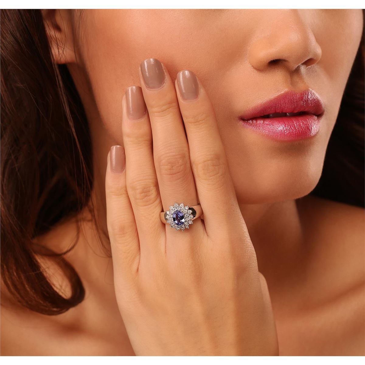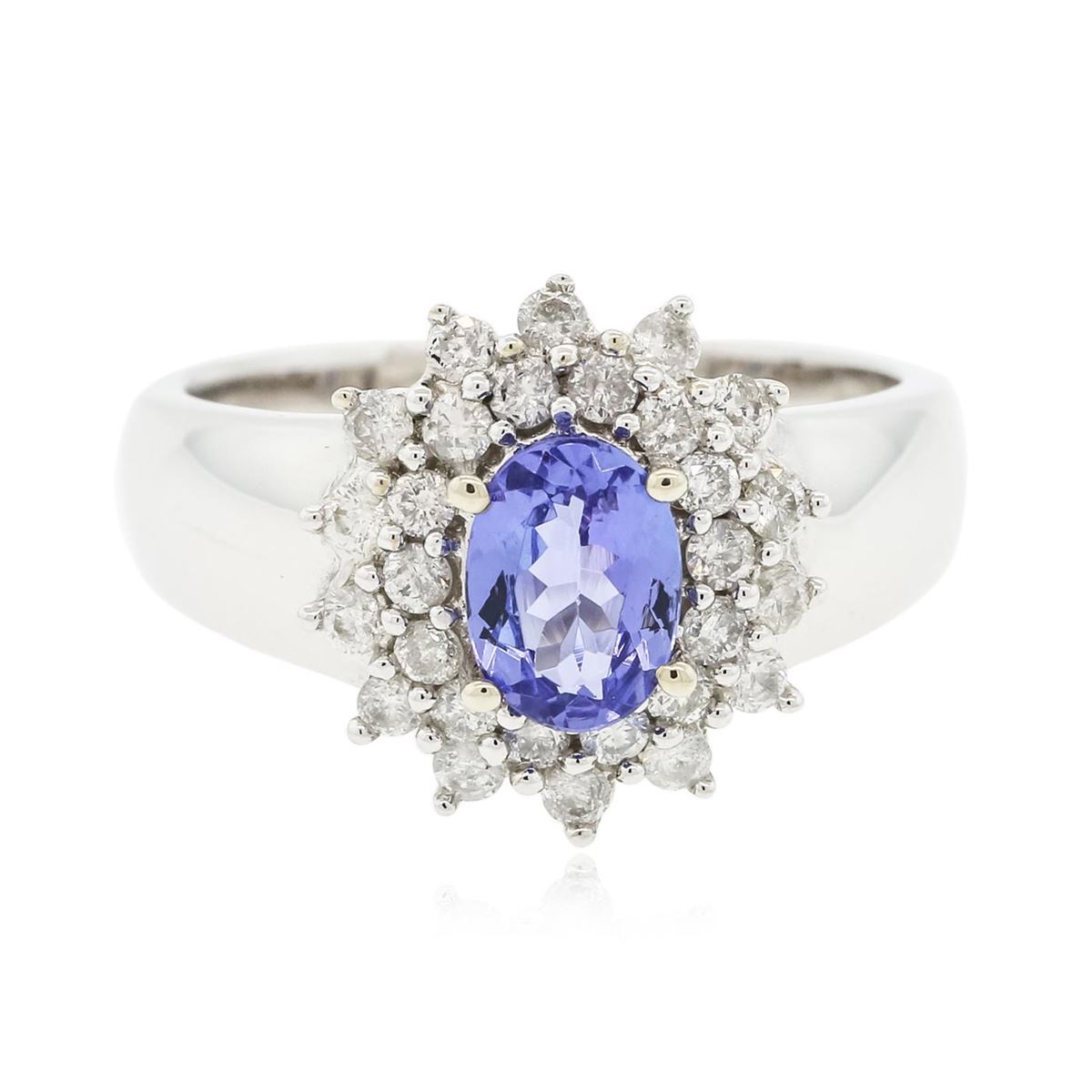 One electronically tested 14KT white gold Ladies combination cast & assembled ring with a bright polish finish. Condition is new. Identified with markings of "14K". Containing: One prong set oval modified brilliant cut natural tanzanite, measuring 7.00 x 5.00 x 3.25mm, approximate weight of 0.83ct., clarity is eye clean, type I, medium, very slightly grayish, violet color, (GIA V 5/3), cut is very good. Colored gemstones are presumed to have been subjected to commonly used color/clarity enhancement processes. Twenty-Eight prong set round brilliant cut diamonds, measuring 2.00 - 2.00 x 1.20mm (depth est.) approximate. Total Weight of 28 Stones = 0.57ct. Clarity: I-1 to I-2. Color: I - J, Cut is Good. Total Weight of Colored Stones 0.83ct. Total Weight of Diamonds 0.57ct. Total Weight of Ring 6.40 grams. GGL Appraised at $4,715.00.