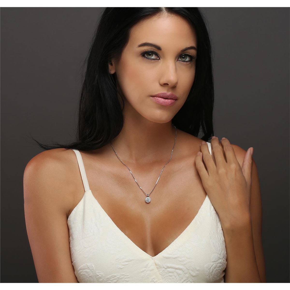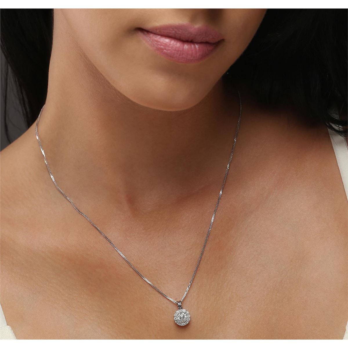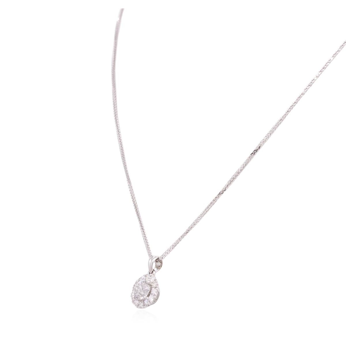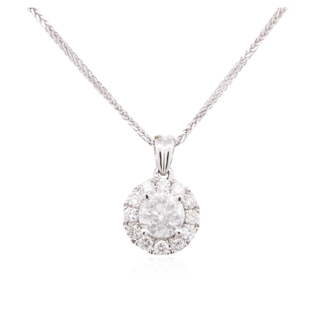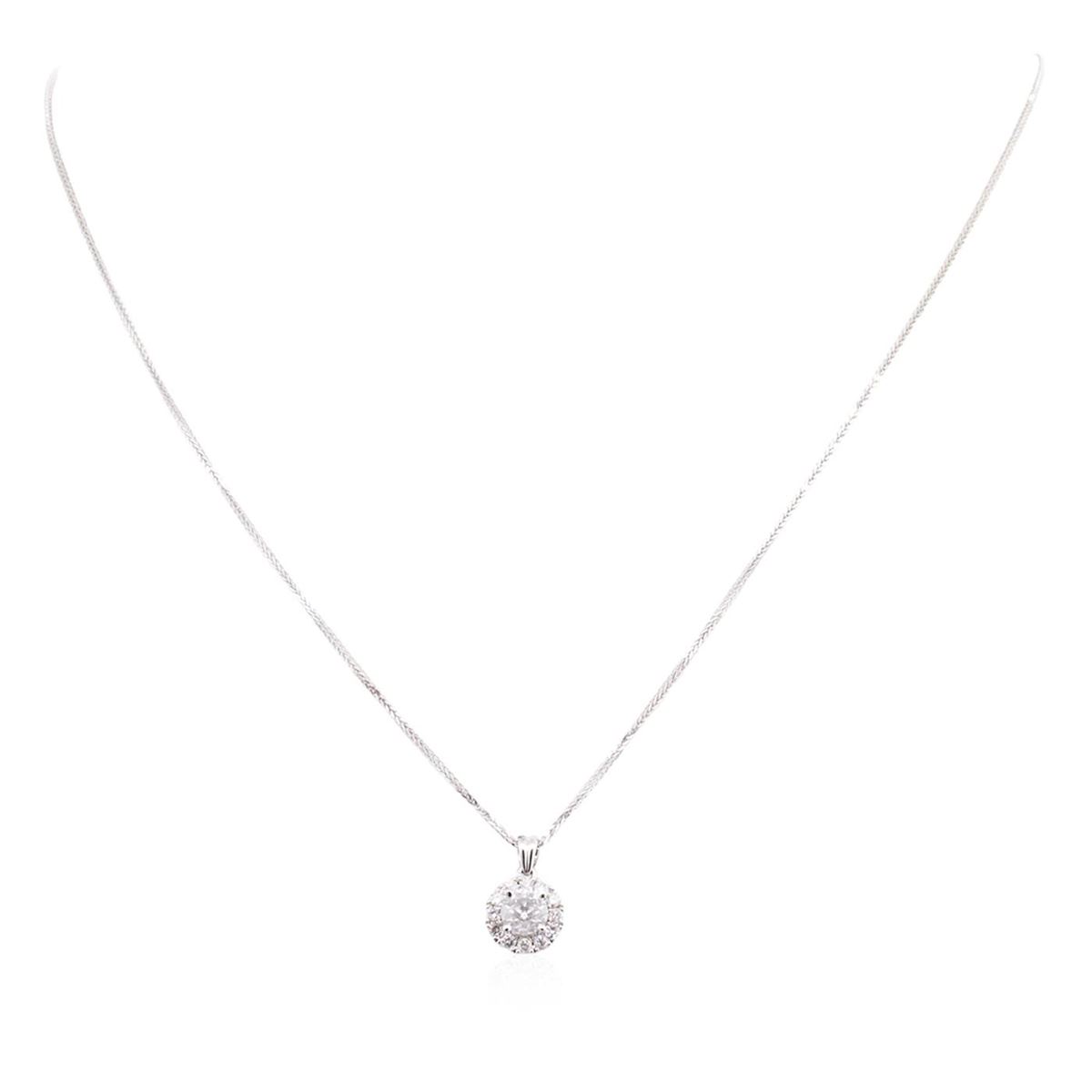 One electronically tested 14KT white gold ladies combination cast & assembled diamond pendant & chain 18.0" long, medium fancy cable with a lobster claw clasp with a bright polish finish. Identified with markings of "14K". Condition is new. Containing: One prong set round brilliant cut diamond, measuring 5.42 - 5.38 x 3.24mm (depth est.) approximate weight of 0.58ct. Clarity: I-2. Color: H, Cut is Good. Twelve prong set round brilliant cut diamonds, measuring 1.80 - 1.80 x 1.08mm (depth est.) approximate total weight of 12 Stones = 0.26ct. Clarity: SI-2 to I-2. Color: H - J, Cut is Good. All diamonds are graded in the mounting, unless otherwise stated. Total Weight of Diamonds 0.83ct. Total Weight of Pendant & Chain 2.60 grams. GGL Appraised at $4,570.00.