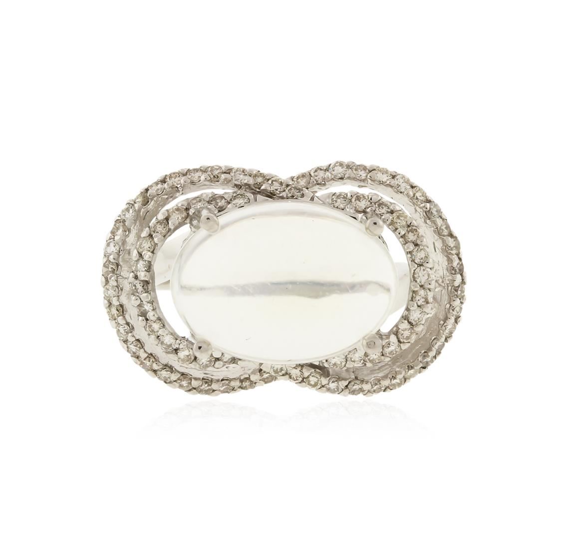 One ring featuring: 14KT white gold weighing 9.80 grams containing one blue moonstone with a total weight of 0.84ct and prong set round diamonds with a total weight of 0.84ct.