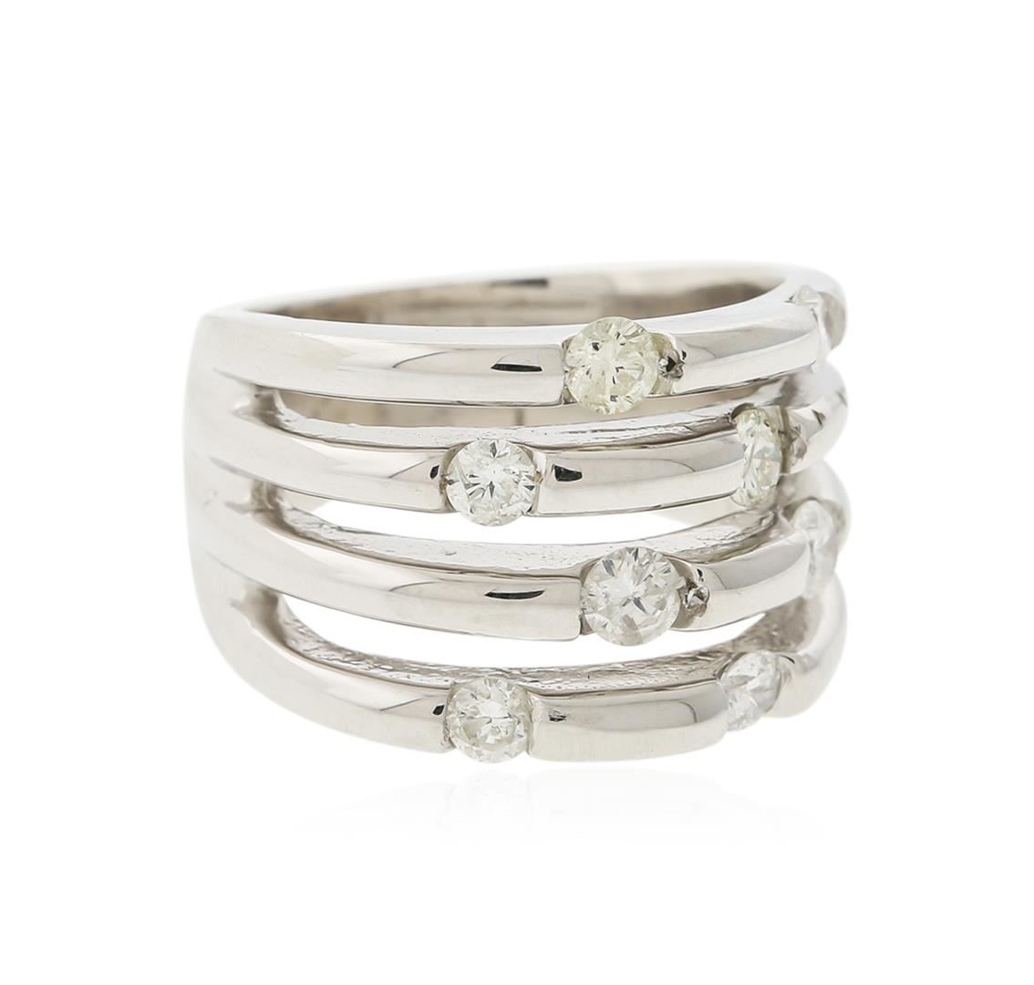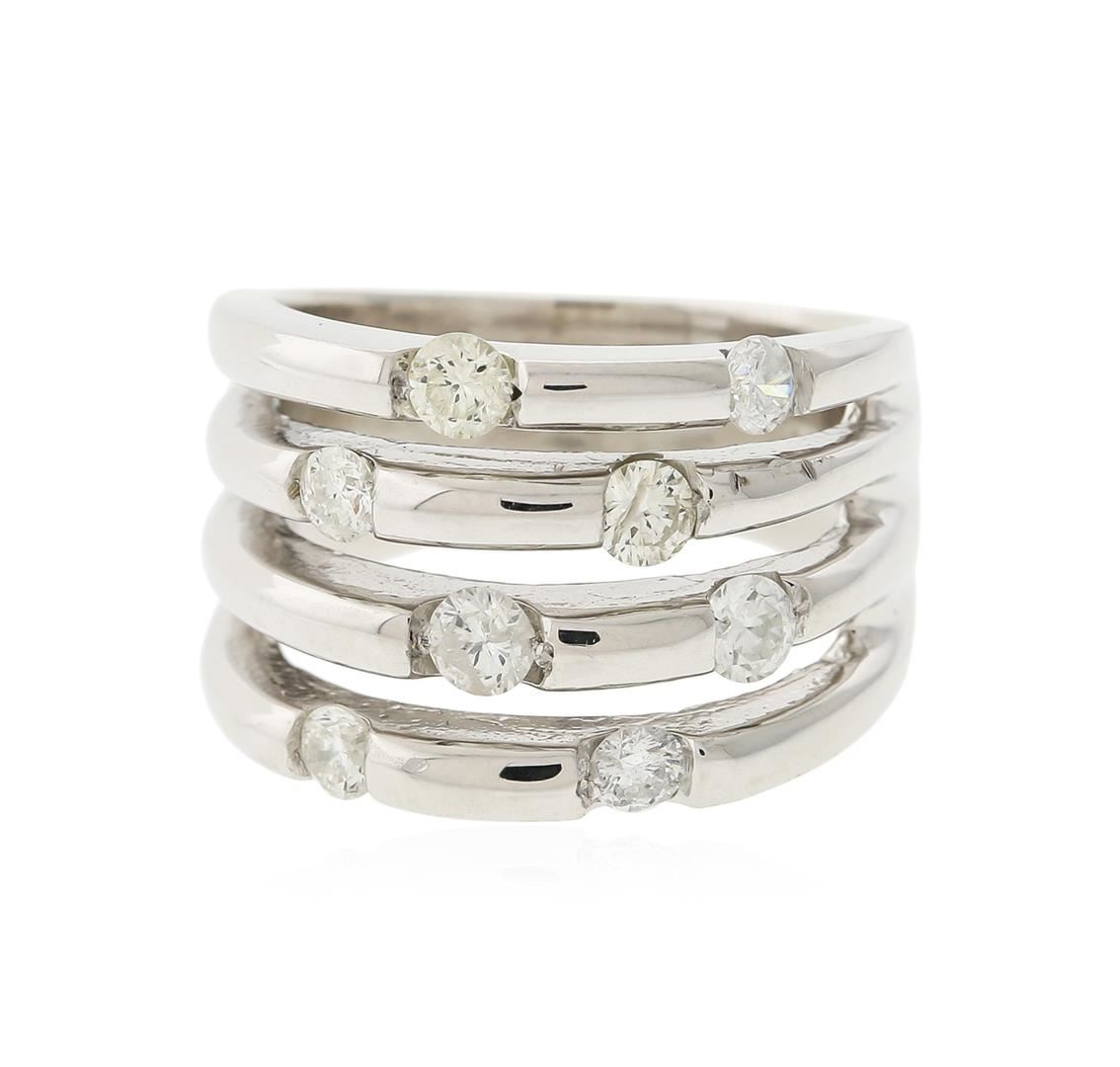 One electronically tested 14KT white gold ladies cast diamond ring. Identified with markings of "14K". Condition is new. Containing: Eight prong set round brilliant cut diamonds, measuring 3.00 - 3.00 x 1.80mm (depth est.) approximate total weight of 8 Stones = 0.84ct. Clarity: SI-2 to I-2. Color: I - J, Cut is Good. Diamonds are graded in the mounting, unless otherwise stated. Total Weight of Diamonds 0.84ct. Total Weight of Ring 12.60 grams. GGL Appraised at $3,105.00.