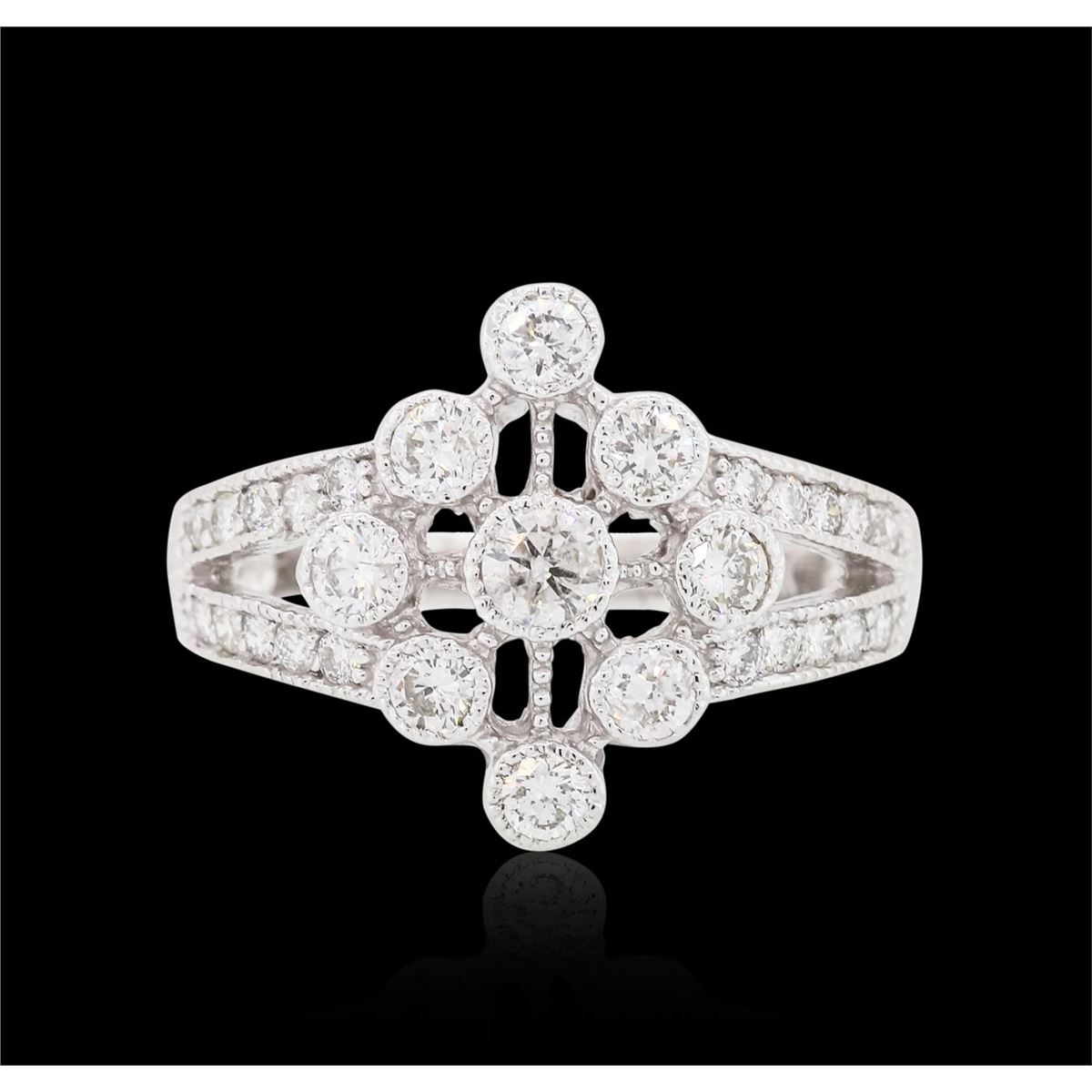 One electronically tested 14KT white gold ladies cast diamond ring with a split shoulder shank with a bright polish finish. Identified with markings of "14K". Condition is new. Containing: Nine gypsy set round brilliant cut diamonds, measuring 3.00 - 2.50 x 1.65mm (depth est.) approximate total weight of 9 Stones = 0.69ct. Clarity: SI-1. Color: I - J, Cut is Good. Thirteen prong set round brilliant cut diamonds, measuring 1.50 - 1.50 x 0.90mm (depth est.) approximate total weight of 13 Stones = 0.16ct. Clarity: SI-1 to SI-2. Color: I - J, Cut is Good. All diamonds are graded in the mounting, unless otherwise stated. Total Weight of Diamonds 0.85ct. Total Weight of Ring 5.60 grams. GGL Appraised at $3,765.00.