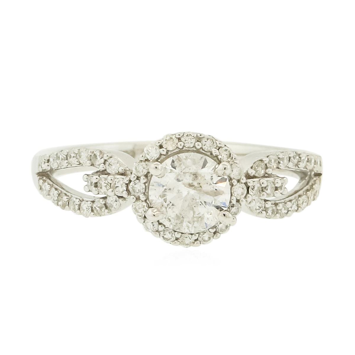 One electronically tested 14KT white gold ladies combination cast & assembled engagement ring with a split shank with a bright polish finish. Identified with markings of "14K". Condition is new. Containing: One prong set round brilliant cut diamond, measuring 5.51 - 5.50 x 3.31mm (depth est.) approximate weight of 0.61ct. Clarity: I-1. Color: J, Cut is Good. Fifty prong set round brilliant cut diamonds, measuring 1.10 - 1.10 x 0.66mm (depth est.) approximate total weight of 50 Stones = 0.24ct. Clarity: I-1 to I-2. Color: I - J, Cut is Good. All diamonds are graded in the mounting, unless otherwise stated. Total Weight of Diamonds 0.85ct. Total Weight of Ring 2.70 grams. GGL Appraised at $5,350.00.