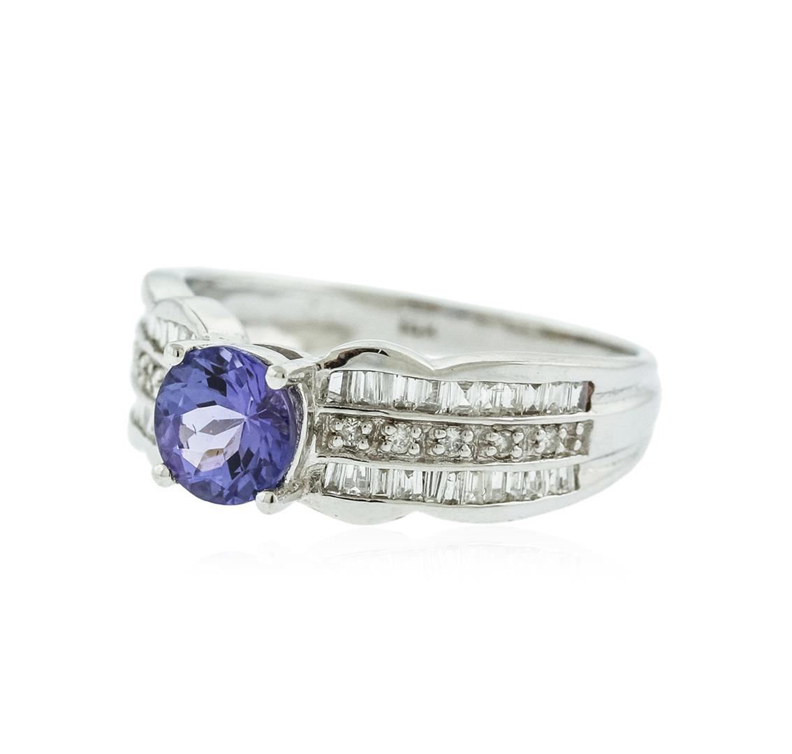 One electronically tested 14KT white gold ladies cast tanzanite and diamond ring with a bright polish finish. Identified with markings of "14K". Condition is new. Containing: One prong set round modified brilliant cut natural tanzanite, measuring 5.80 - 5.80 x 3.77 mm, approximate weight of 0.85ct., clarity is eye clean, type I, medium light, very slightly grayish, violet color, (GIA V 4/3), cut is good. Ten prong set round brilliant cut diamonds, measuring 1.10 - 1.10 x 0.66mm (depth est.) approximate total weight of 10 Stones = 0.05ct. Clarity: SI-2 to I-1. Color: I - J. Forty-Eight channel set baguette cut diamonds, measuring 1.30 x 1.00 x 0.85mm (depth est.) approximate total weight of 48 Stones = 0.49ct. Clarity: I-1 to I-2. Color: I - J. Colored gemstones are presumed to have been subjected to commonly used enhancement processes. All diamonds and colored gemstones are graded in the mounting, unless otherwise stated. Total Weight of Colored Stones 0.85ct. Total Weight of Diamonds 0.53ct. Total Weight of Ring 3.20 grams. GGL Appraised at $1,890.00.