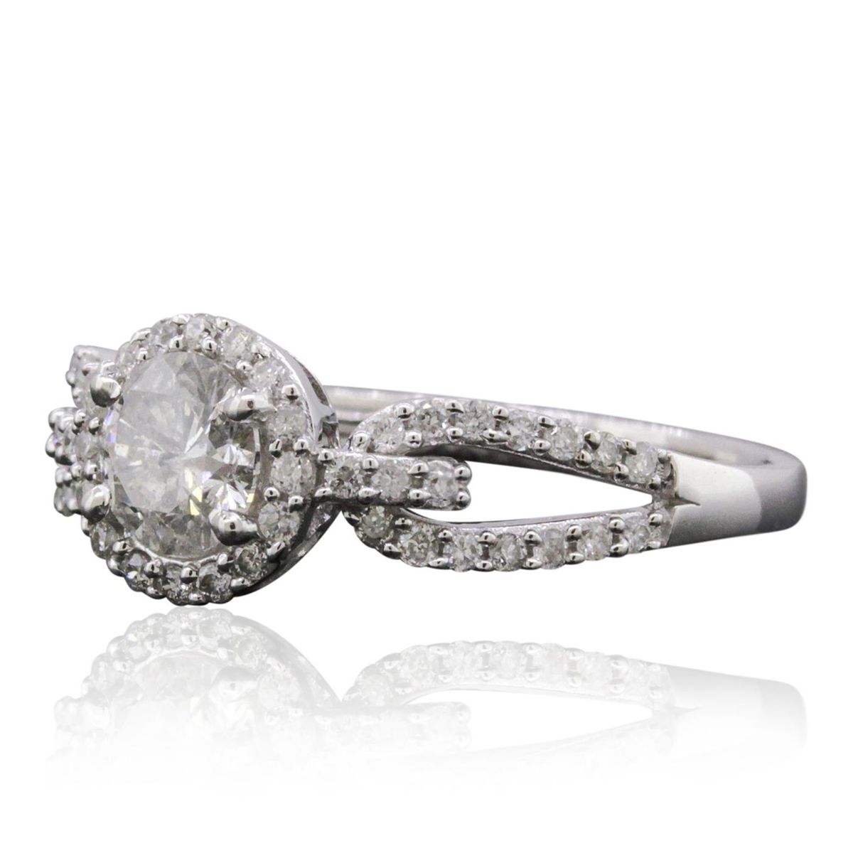 One electronically tested 14KT white gold ladies combination cast & assembled engagement ring with a split shank with a bright polish finish. Identified with markings of "14K". Condition is new. Containing: One prong set round brilliant cut diamond, measuring 5.51 - 5.50 x 3.31mm (depth est.) approximate weight of 0.61ct. Clarity: I-1. Color: J, Cut is Good. Fifty prong set round brilliant cut diamonds, measuring 1.10 - 1.10 x 0.66mm (depth est.) approximate total weight of 50 Stones = 0.24ct. Clarity: I-1 to I-2. Color: I - J, Cut is Good. All diamonds are graded in the mounting, unless otherwise stated. Total Weight of Diamonds 0.85ct. Total Weight of Ring 2.70 grams. GGL Appraised at $5,350.00.