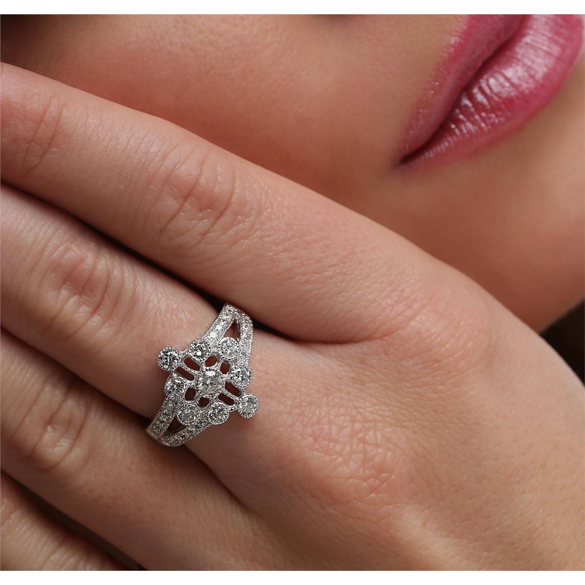 One electronically tested 14KT white gold ladies cast diamond ring with a split shoulder shank with a bright polish finish. Identified with markings of "14K". Condition is new. Containing: Nine gypsy set round brilliant cut diamonds, measuring 3.00 - 2.50 x 1.65mm (depth est.) approximate total weight of 9 Stones = 0.69ct. Clarity: SI-1. Color: I - J, Cut is Good. Thirteen prong set round brilliant cut diamonds, measuring 1.50 - 1.50 x 0.90mm (depth est.) approximate total weight of 13 Stones = 0.16ct. Clarity: SI-1 to SI-2. Color: I - J, Cut is Good. All diamonds are graded in the mounting, unless otherwise stated. Total Weight of Diamonds 0.85ct. Total Weight of Ring 5.60 grams. GGL Appraised at $3,765.00.