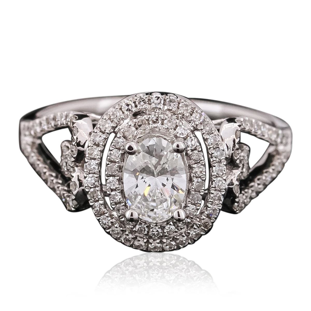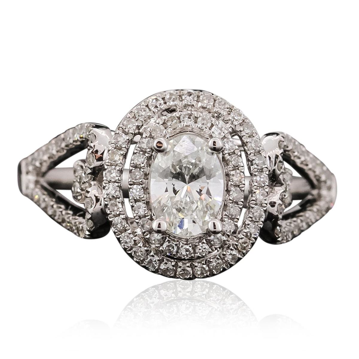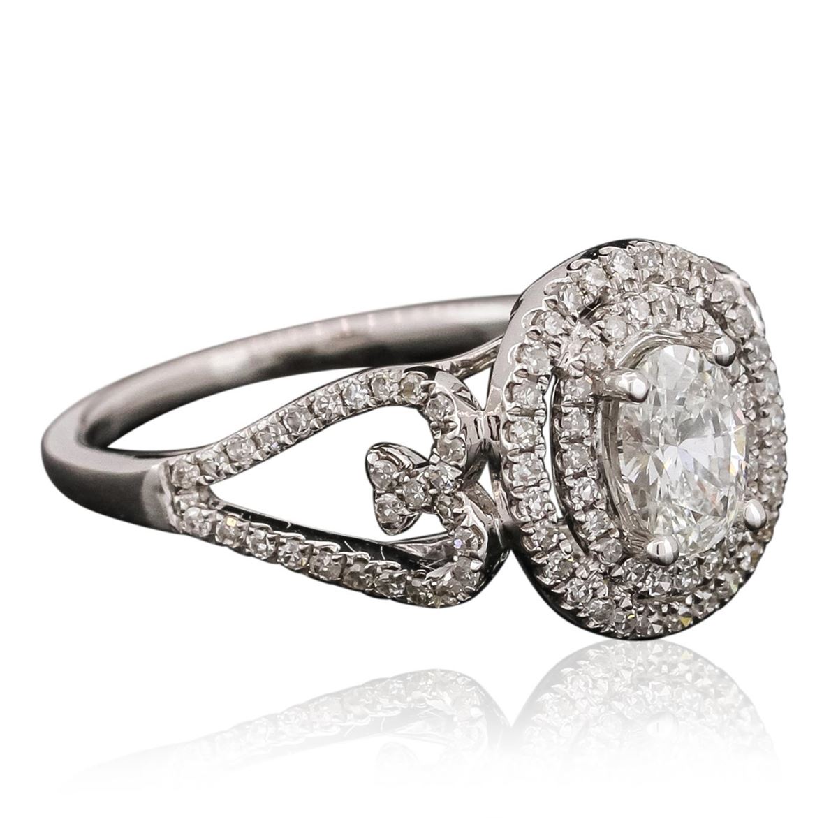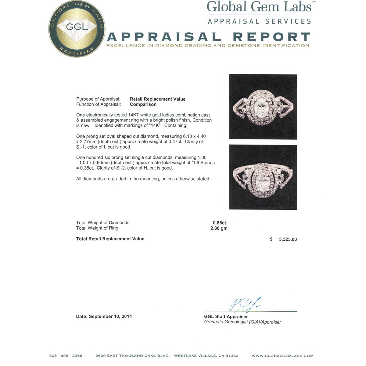 One electronically tested 14KT white gold ladies combination cast & assembled engagement ring with a bright polish finish.  Identified with markings of "14K". Condition is new. Containing: One prong set oval shaped cut diamond, measuring 6.10 x 4.40 x 2.77mm (depth est.) approximate weight of 0.47ct. Clarity: SI-1. Color: I, Cut is Good.  One Hundred Six prong set single cut diamonds, measuring 1.00 - 1.00 x 0.60mm (depth est.) approximate total weight of 106 Stones = 0.38ct. Clarity: SI-2. Color: H, Cut is Good. All diamonds are graded in the mounting, unless otherwise stated. Total Weight of Diamonds 0.86ct. Total Weight of Ring 2.80 grams. GGL Appraised at $5,325.00.