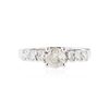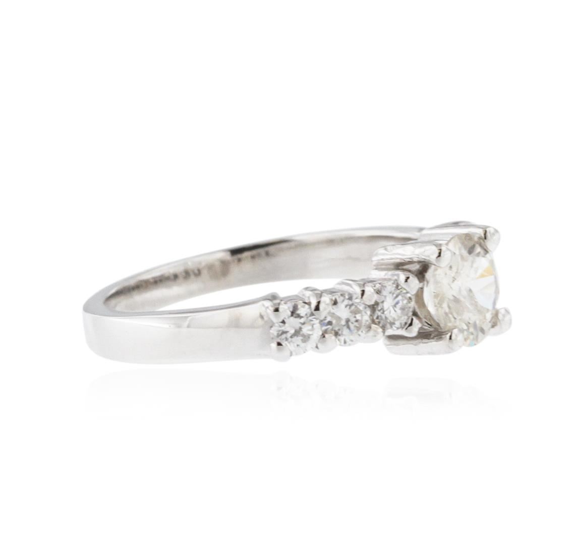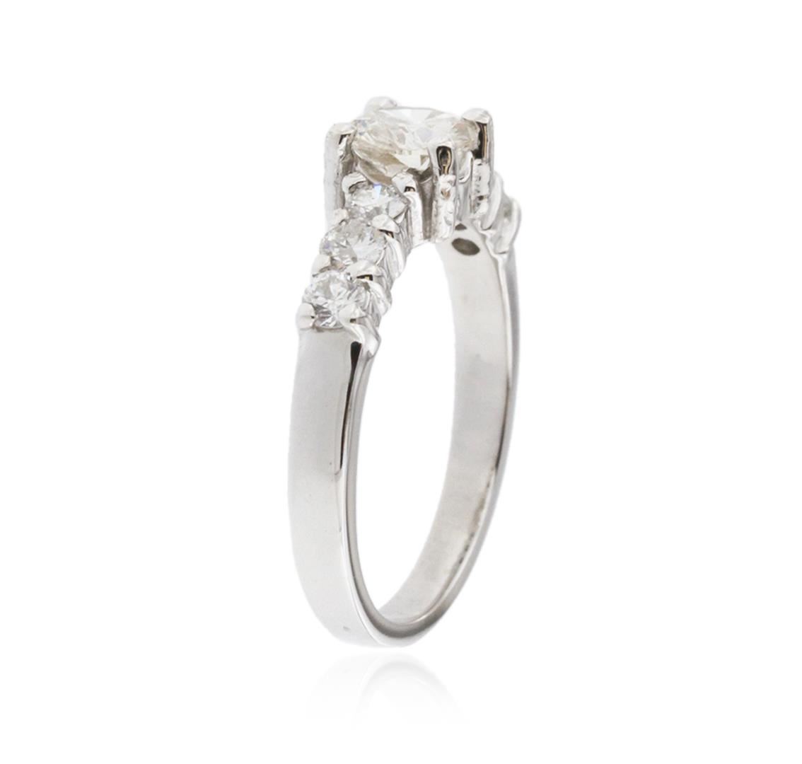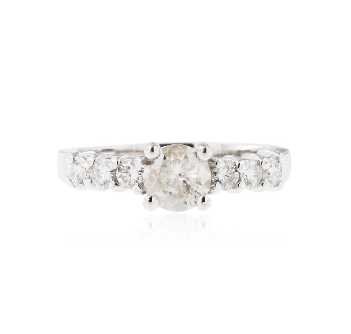 One electronically tested 14KT white gold ladies cast diamond engagement ring with a bright polish finish. Condition is new. Containing: One prong set round brilliant cut diamond, measuring 5.40 - 5.30 x 3.21mm (depth est.) approximate weight of 0.56ct. Clarity: I-3. Color: L. Six prong set round brilliant cut diamonds, measuring 2.40 - 2.40 x 1.44mm (depth est.) approximate total weight of 6 Stones = 0.30ct. Clarity: SI-1 to SI-2. Color: G - H, Cut is Good. All diamonds are graded in the mounting, unless otherwise stated. Total Weight of Diamonds 0.86ct. Total Weight of Engagement Ring 2.80 grams. GGL Appraised at $2,820.00.