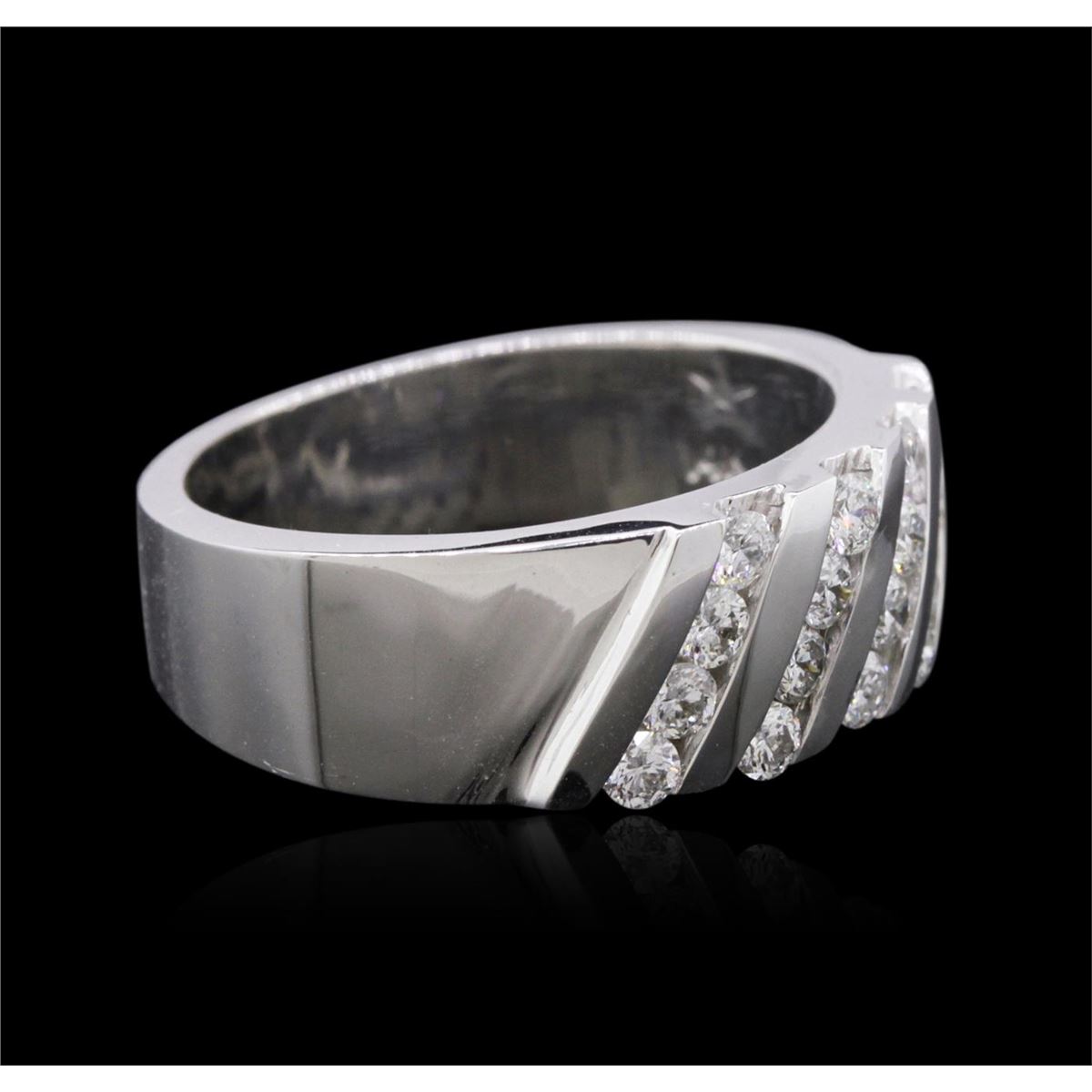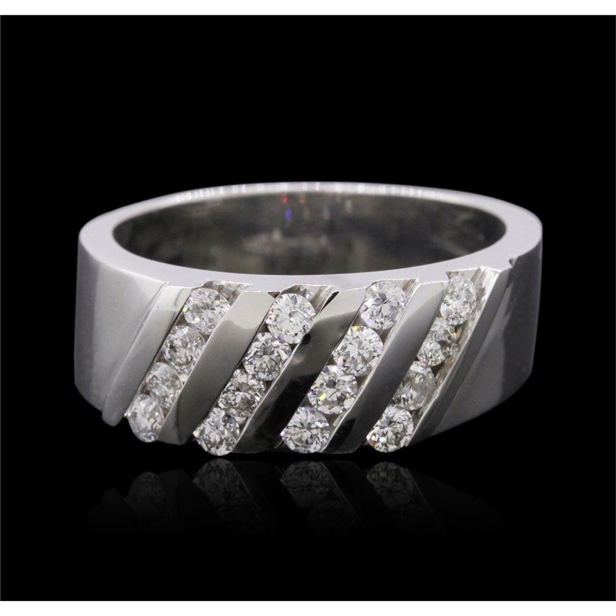 One electronically tested 14KT white gold gents cast diamond ring with a bright polish finish. The ring features four diagonal diamond ribbons, completed by a five and one-half millimeter wide band. Identified with markings of 14K. Condition is new, good workmanship. Containing: Sixteen channel set round brilliant cut diamonds, measuring 2.40 - 2.30 x 1.41mm (depth est.) approximate total weight of 16 Stones = 0.86ct. Graded in the setting. Clarity: SI-1 to I-1. Color: G - I. Total Weight of Diamonds 0.86ct. Total Weight of Ring 11.06 grams. AIG Appraised at $4,590.00.