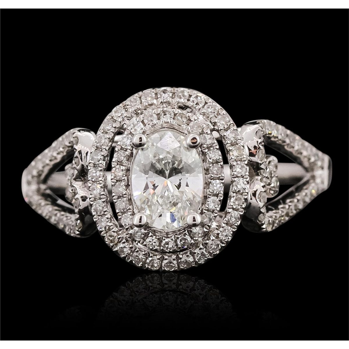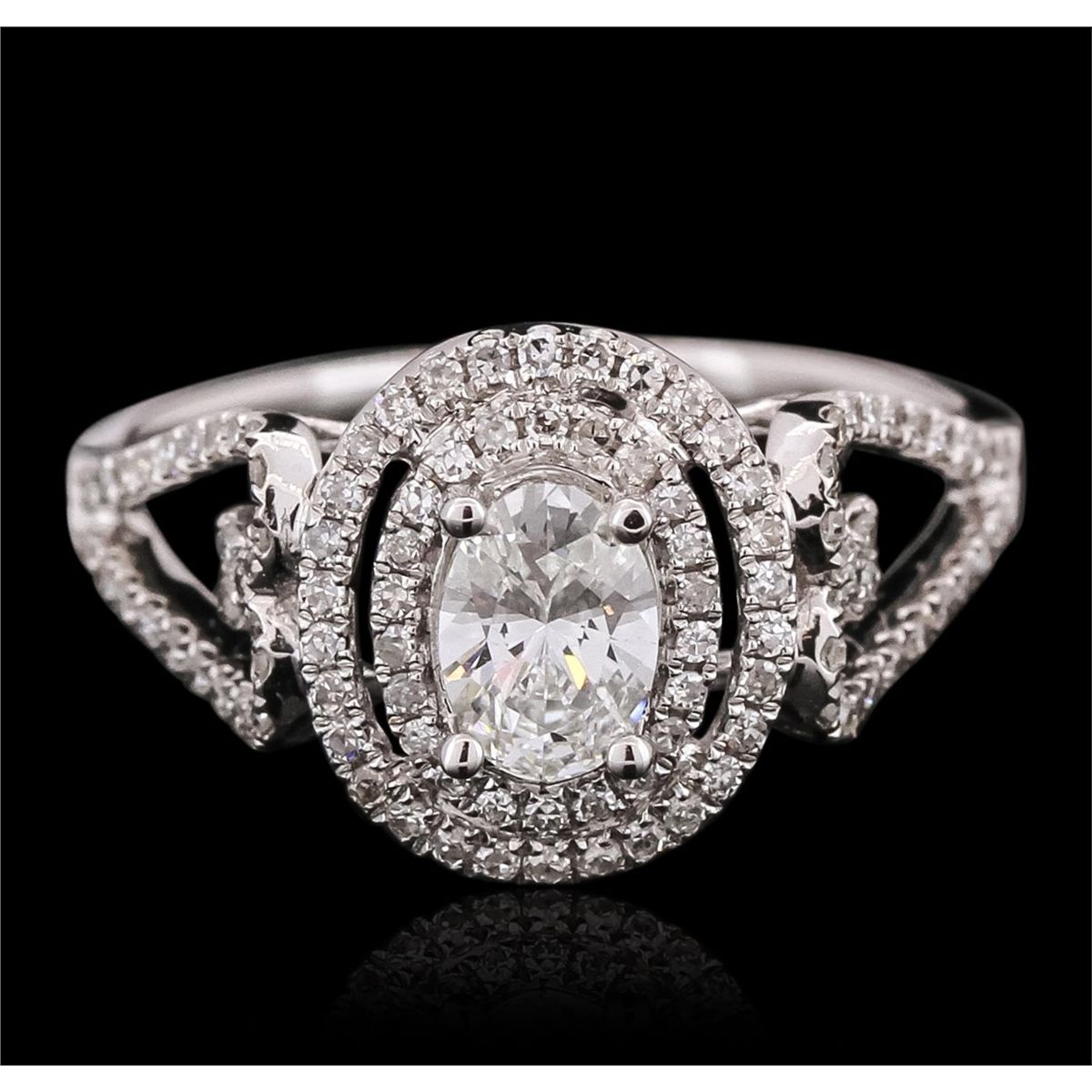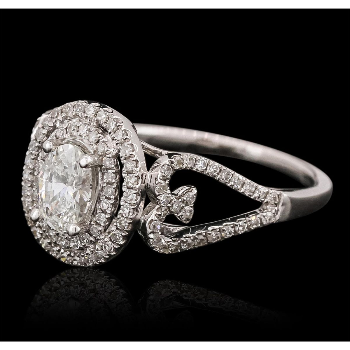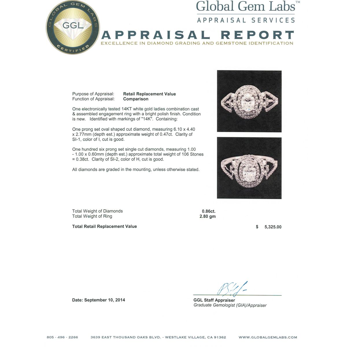 One electronically tested 14KT white gold ladies combination cast & assembled engagement ring with a bright polish finish. Identified with markings of "14K". Condition is new. Containing: One prong set oval shaped cut diamond, measuring 6.10 x 4.40 x 2.77mm (depth est.) approximate weight of 0.47ct. Clarity: SI-1. Color: I, Cut is Good. One Hundred Six prong set single cut diamonds, measuring 1.00 - 1.00 x 0.60mm (depth est.) approximate total weight of 106 Stones = 0.38ct. Clarity: SI-2. Color: H, Cut is Good. All diamonds are graded in the mounting, unless otherwise stated. Total Weight of Diamonds 0.86ct. Total Weight of Ring 2.80 grams. GGL Appraised at $5,325.00.