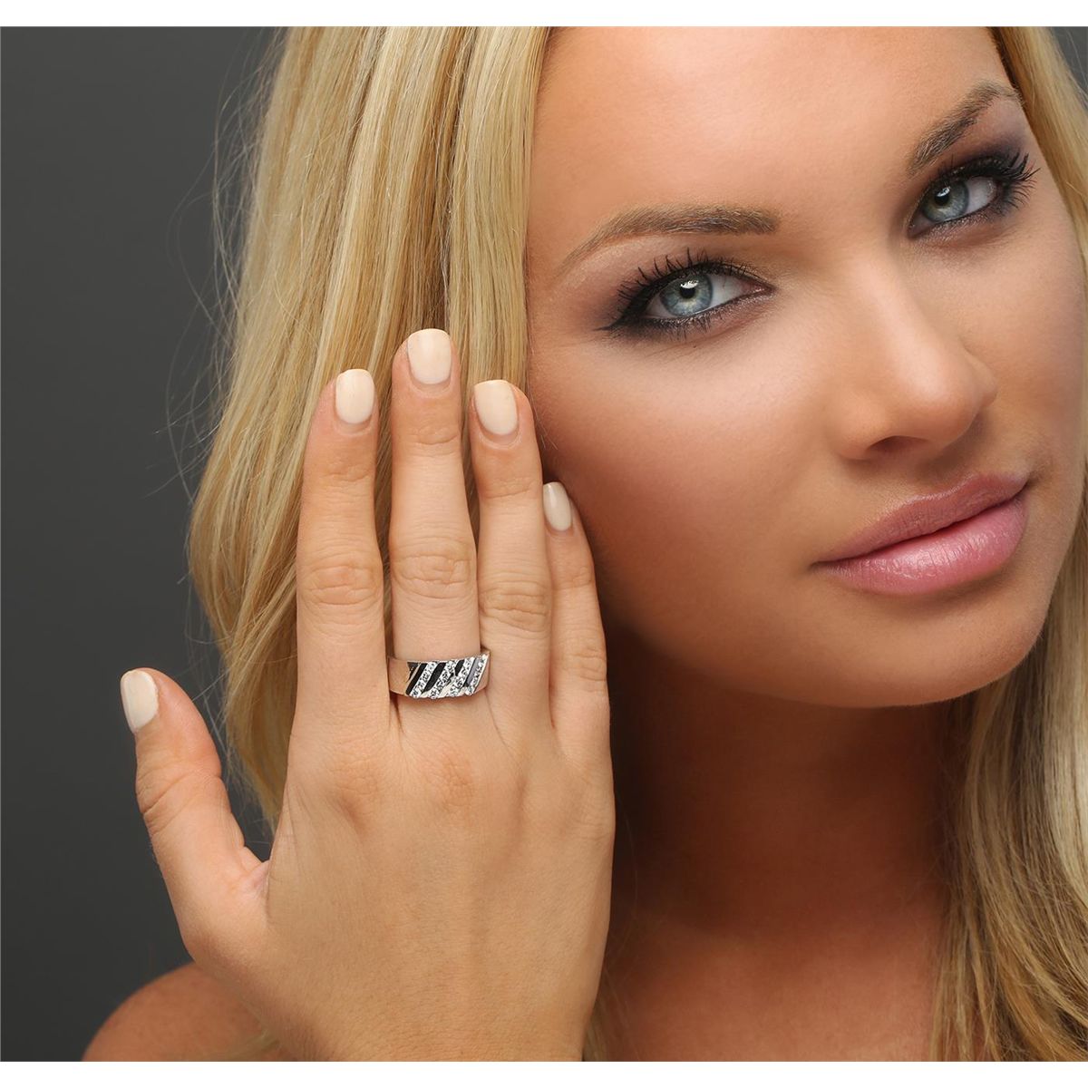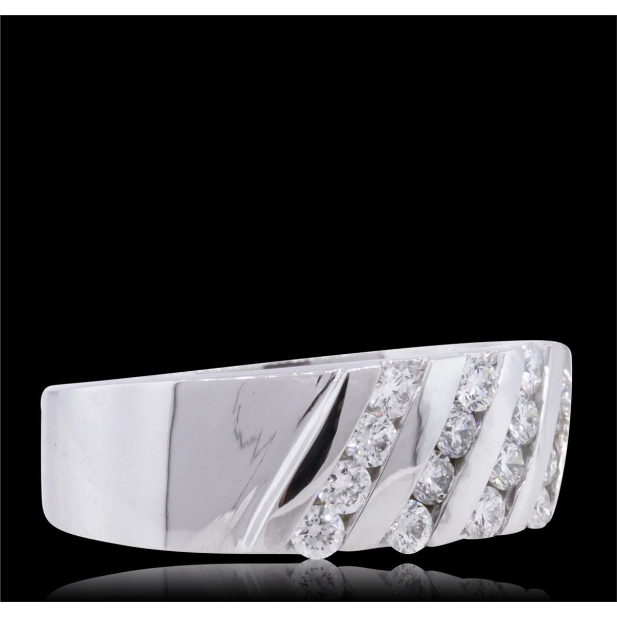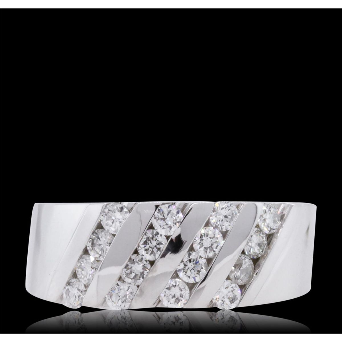 One electronically tested 14KT white gold gents cast diamond ring with a bright polish finish. The ring features four diagonal diamond ribbons, completed by a five and one-half millimeter wide band. Identified with markings of 14K. Condition is new, good workmanship. Containing: Sixteen channel set round brilliant cut diamonds, measuring 2.40 - 2.30 x 1.41mm (depth est.) approximate total weight of 16 Stones = 0.86ct. Graded in the setting. Clarity: SI-1 to I-1. Color: G - I. Total Weight of Diamonds 0.86ct. Total Weight of Ring 11.06 grams. AIG Appraised at $4,590.00.