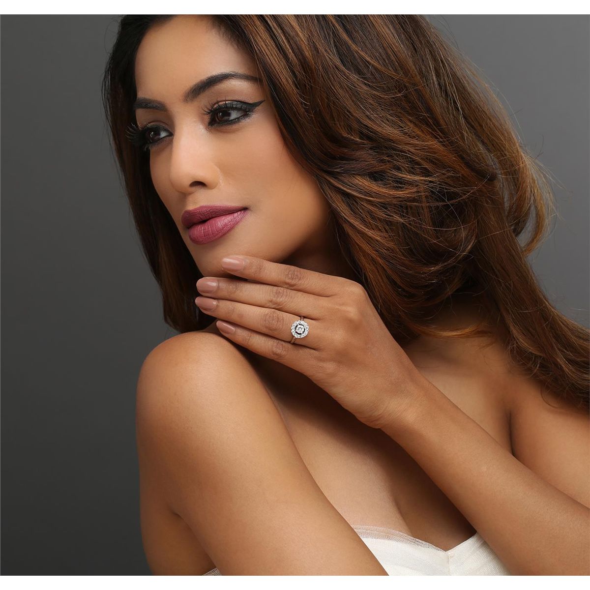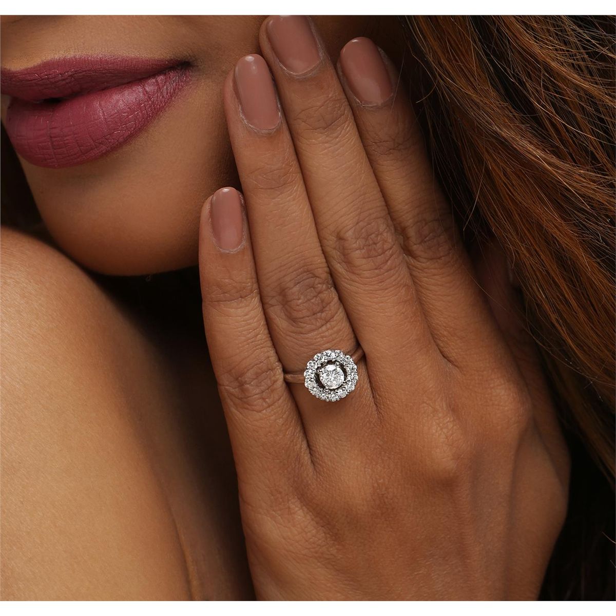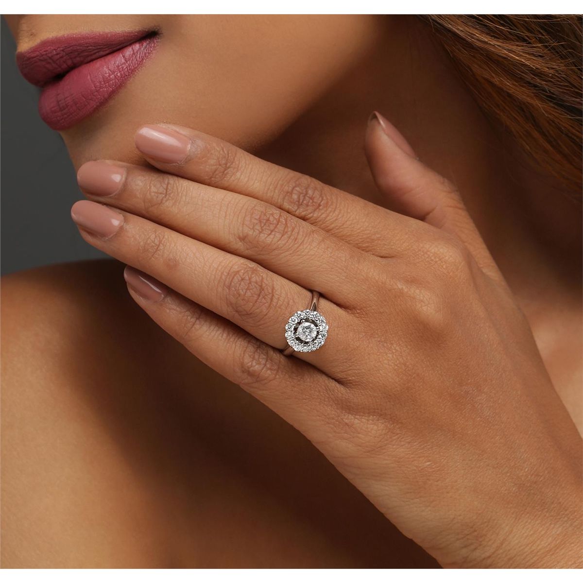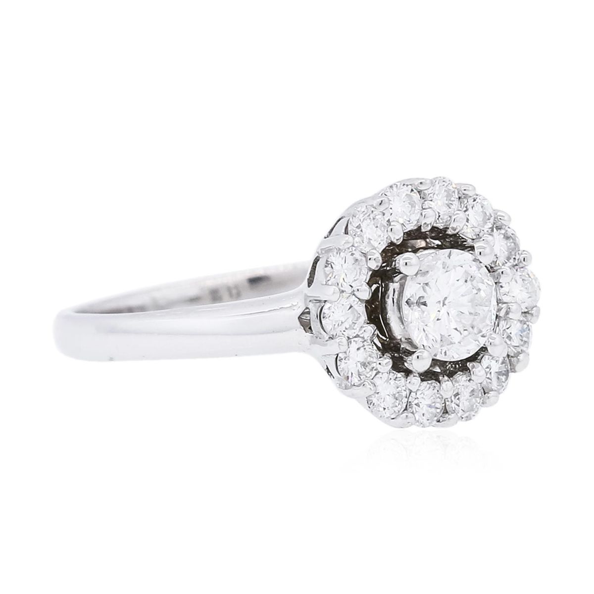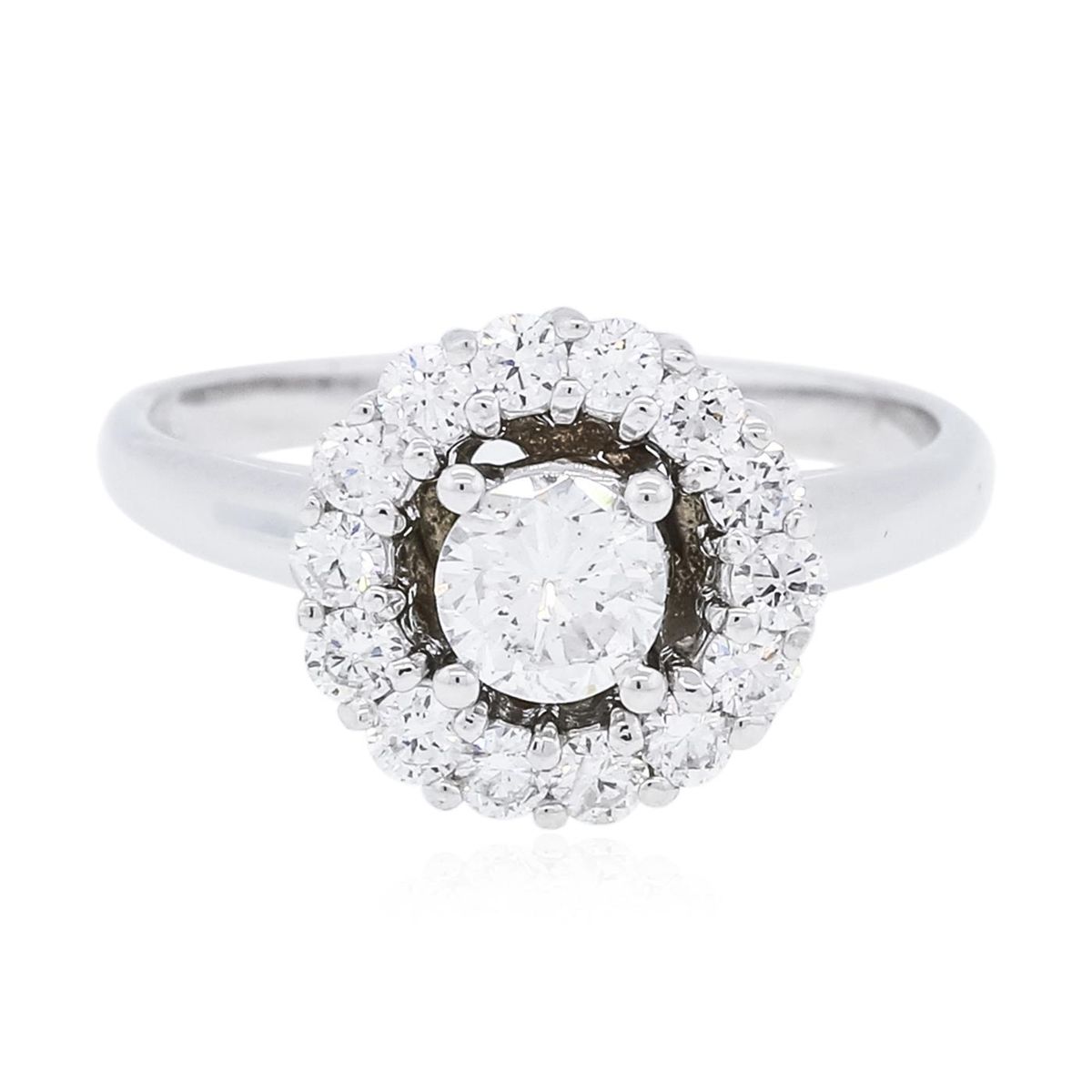 One electronically tested 14KT white gold ladies combination cast & assembled engagement ring with a flat shank with a bright polish finish. Identified with markings of "K14". Condition is new. Containing: One prong set round brilliant cut diamond, measuring 4.85 - 4.81 x 3.14mm (depth est.) approximate weight of 0.45ct. Clarity: I-1. Color: J, Cut is Good. Fourteen prong set round brilliant cut diamonds, measuring 2.00 - 2.00 x 1.20mm (depth est.) approximate total weight of 14 Stones = 0.41ct. Clarity: SI-1 to SI-2. Color: I, Cut is Good. All diamonds are graded in the mounting, unless otherwise stated. Total Weight of Diamonds 0.86ct. Total Weight of Ring 3.80 grams. GGL Appraised at $4,195.00.