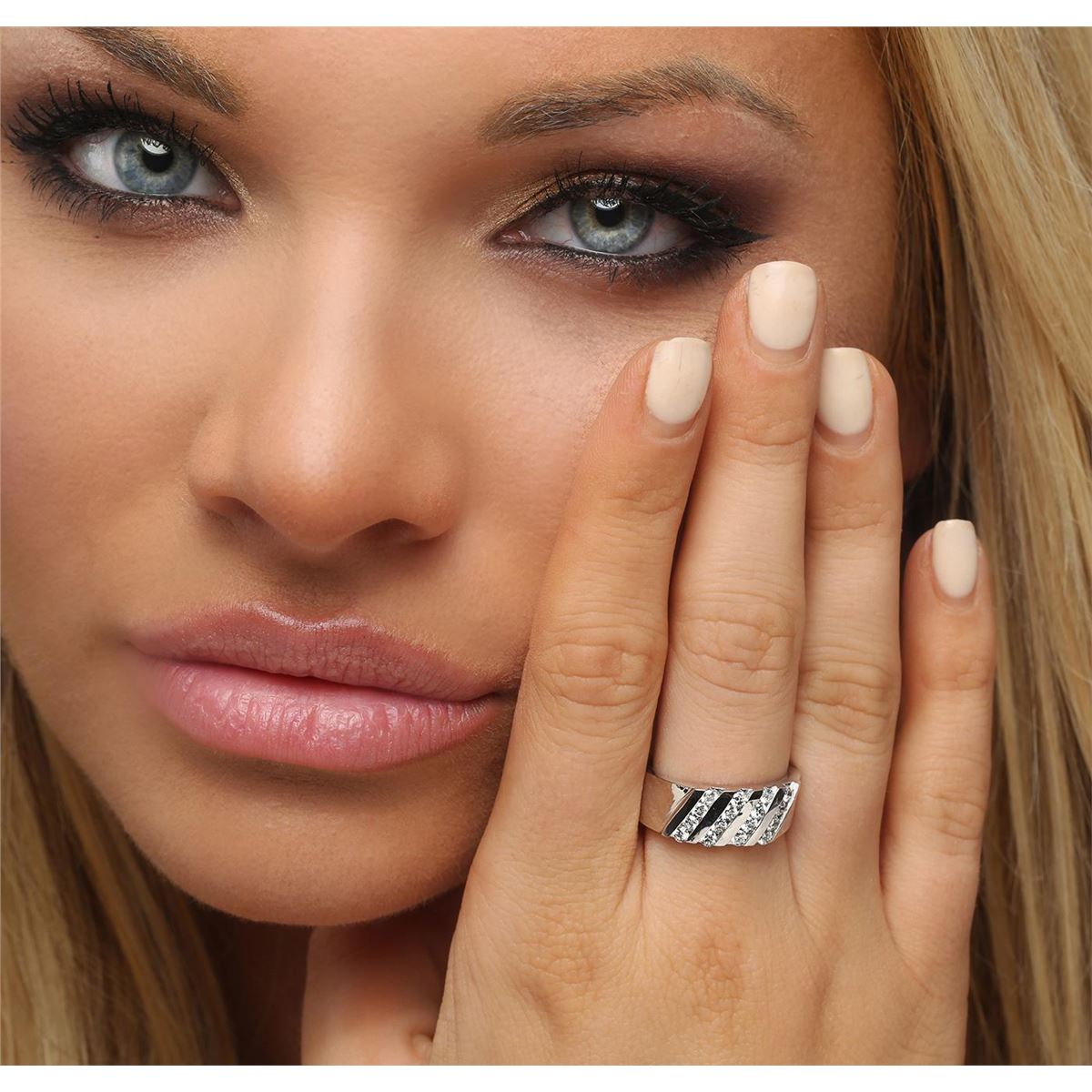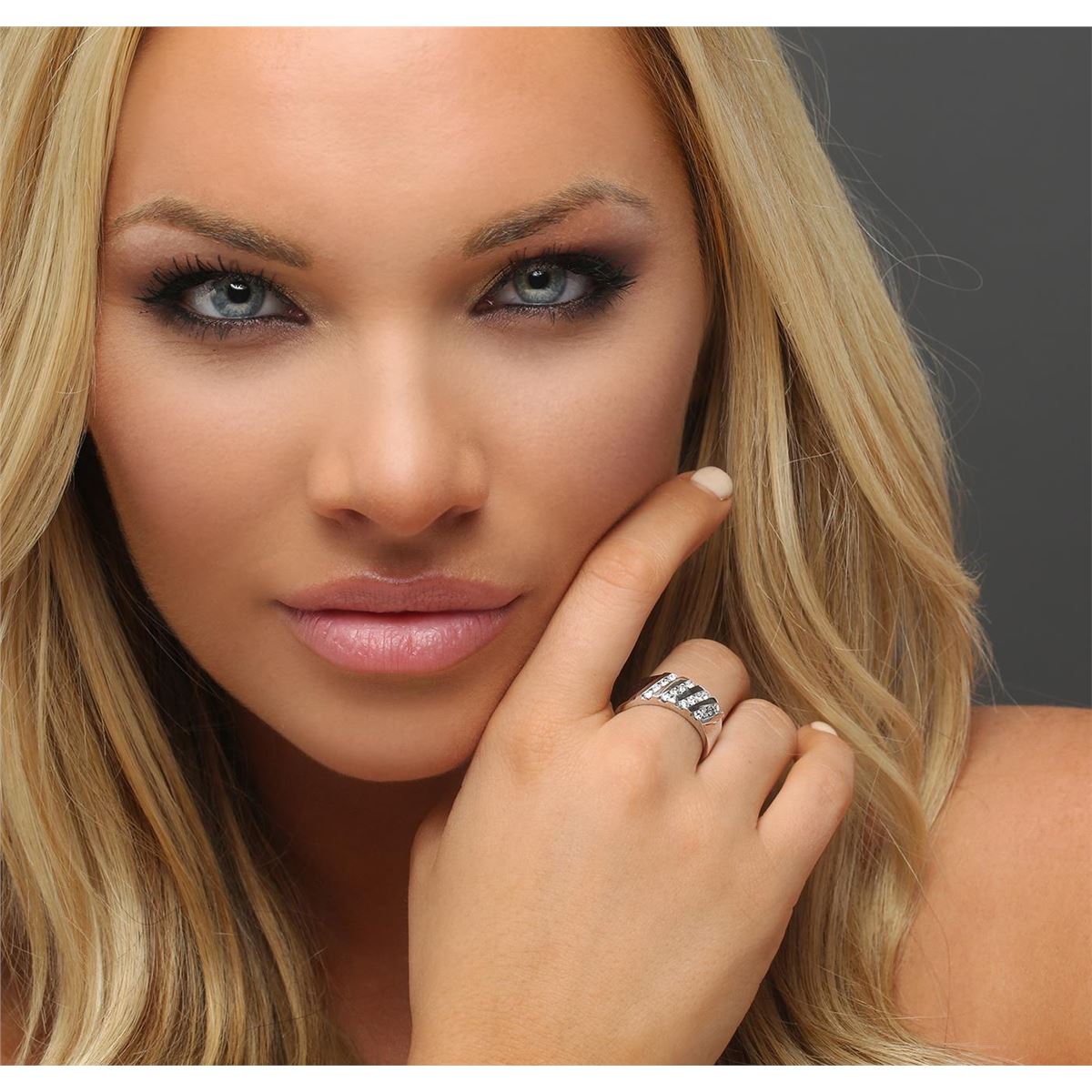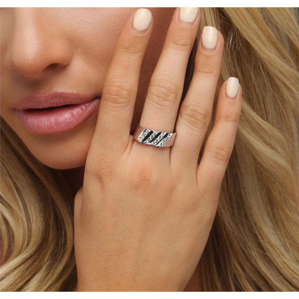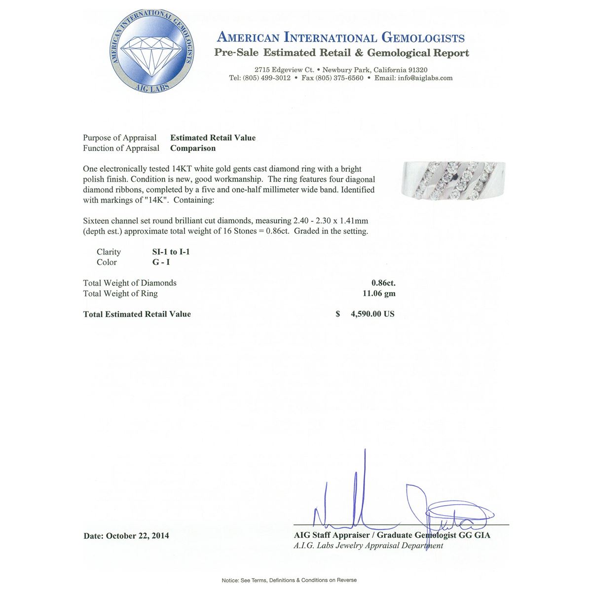 One electronically tested 14KT white gold gents cast diamond ring with a bright polish finish. The ring features four diagonal diamond ribbons, completed by a five and one-half millimeter wide band. Identified with markings of 14K. Condition is new, good workmanship. Containing: Sixteen channel set round brilliant cut diamonds, measuring 2.40 - 2.30 x 1.41mm (depth est.) approximate total weight of 16 Stones = 0.86ct. Graded in the setting. Clarity: SI-1 to I-1. Color: G - I. Total Weight of Diamonds 0.86ct. Total Weight of Ring 11.06 grams. AIG Appraised at $4,590.00.