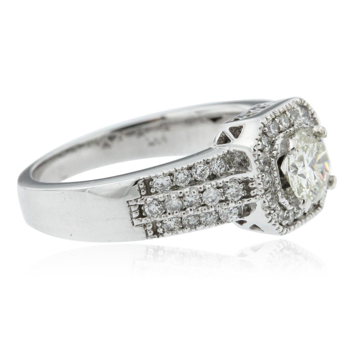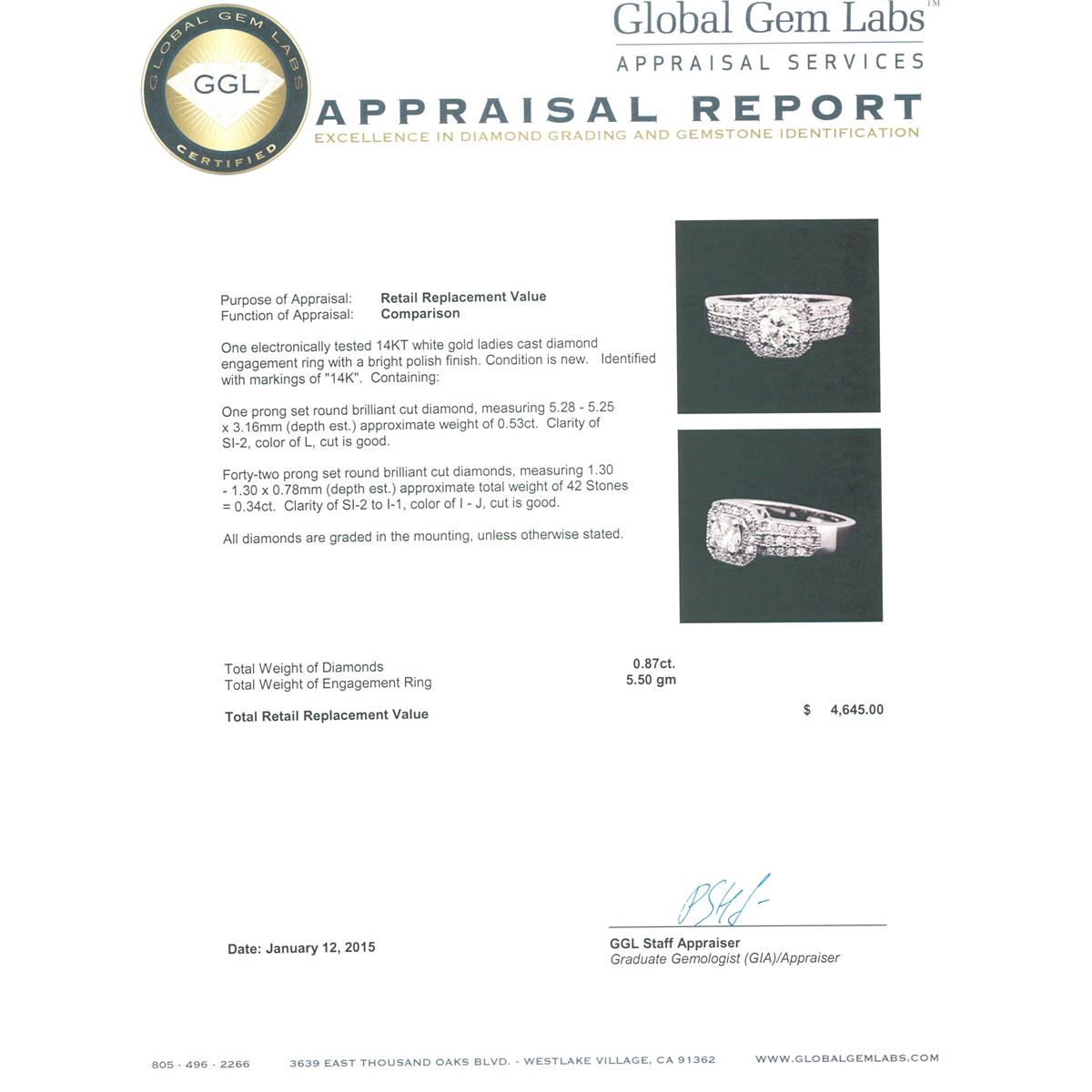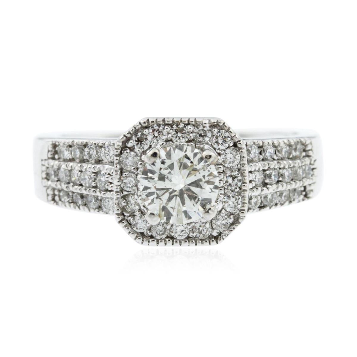 One electronically tested 14KT white gold ladies cast diamond engagement ring with a bright polish finish. Identified with markings of "14K". Condition is new. Containing: One prong set round brilliant cut diamond, measuring 5.28 - 5.25 x 3.16mm (depth est.) approximate weight of 0.53ct. Clarity: SI-2. Color: L, Cut is Good. Forty-Two prong set round brilliant cut diamonds, measuring 1.30 - 1.30 x 0.78mm (depth est.) approximate total weight of 42 Stones = 0.34ct. Clarity: SI-2 to I-1. Color: I - J, Cut is Good. All diamonds are graded in the mounting, unless otherwise stated. Total Weight of Diamonds 0.87ct. Total Weight of Engagement Ring 5.50 grams. GGL Appraised at $4,645.00.