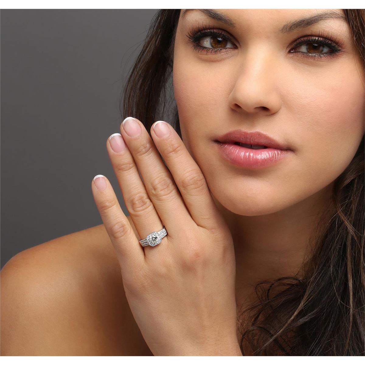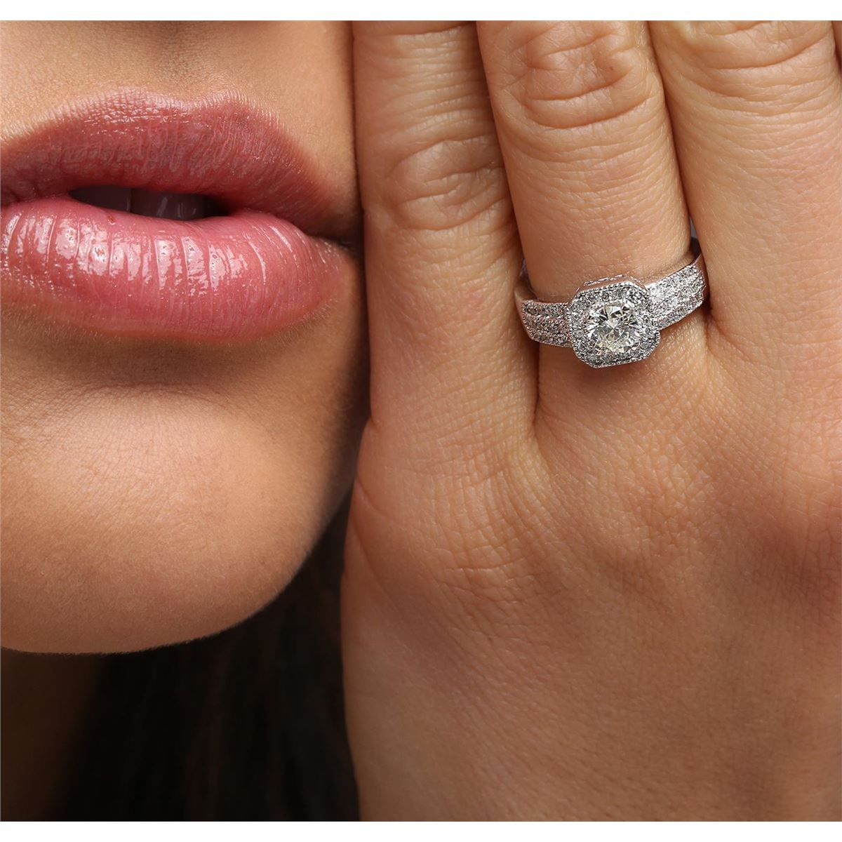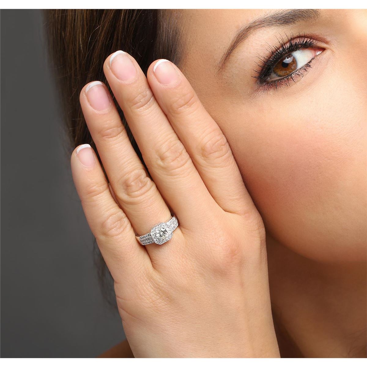 One electronically tested 14KT white gold ladies cast diamond engagement ring with a bright polish finish. Identified with markings of "14K". Condition is new. Containing: One prong set round brilliant cut diamond, measuring 5.28 - 5.25 x 3.16mm (depth est.) approximate weight of 0.53ct. Clarity: SI-2. Color: L, Cut is Good. Forty-Two prong set round brilliant cut diamonds, measuring 1.30 - 1.30 x 0.78mm (depth est.) approximate total weight of 42 Stones = 0.34ct. Clarity: SI-2 to I-1. Color: I - J, Cut is Good. All diamonds are graded in the mounting, unless otherwise stated. Total Weight of Diamonds 0.87ct. Total Weight of Engagement Ring 5.50 grams. GGL Appraised at $4,645.00.
