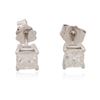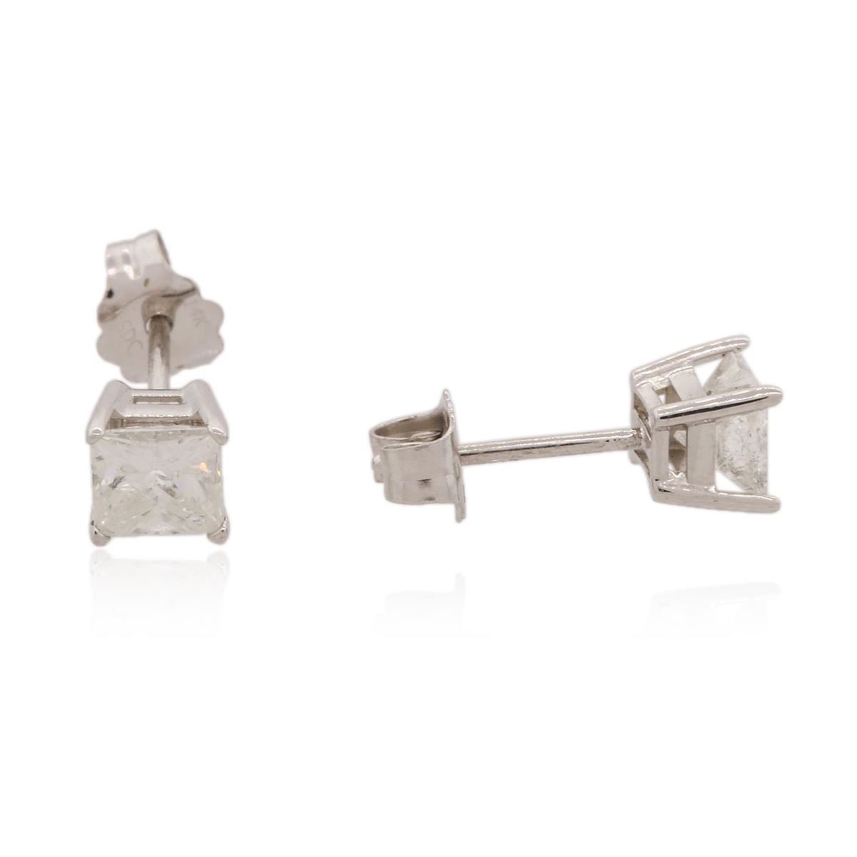 One pair electronically tested 14KT white gold cast & assembled diamond solitaire earrings with standard backs. Identified with markings of "14K". Condition is new, good workmanship. Containing: One prong set princess cut diamond, measuring 4.50 x 4.33 x 2.90mm (depth est.) approximate weight of 0.47ct. Graded in the setting. Clarity: I-1. Color: I. Depth 67.0%. Table 83.1%. One prong set princess cut diamond, measuring 4.10 x 4.10 x 2.80mm (depth est.), 3.00% GTCF approximate weight of 0.40ct. Graded in the setting. Clarity: I-2. Color: H. Depth 68.3%. Table 84.2%. Total Weight of Diamonds 0.87ct. Total Weight of Earrings 0.81 grams. AIG Appraised at $2,480.00.