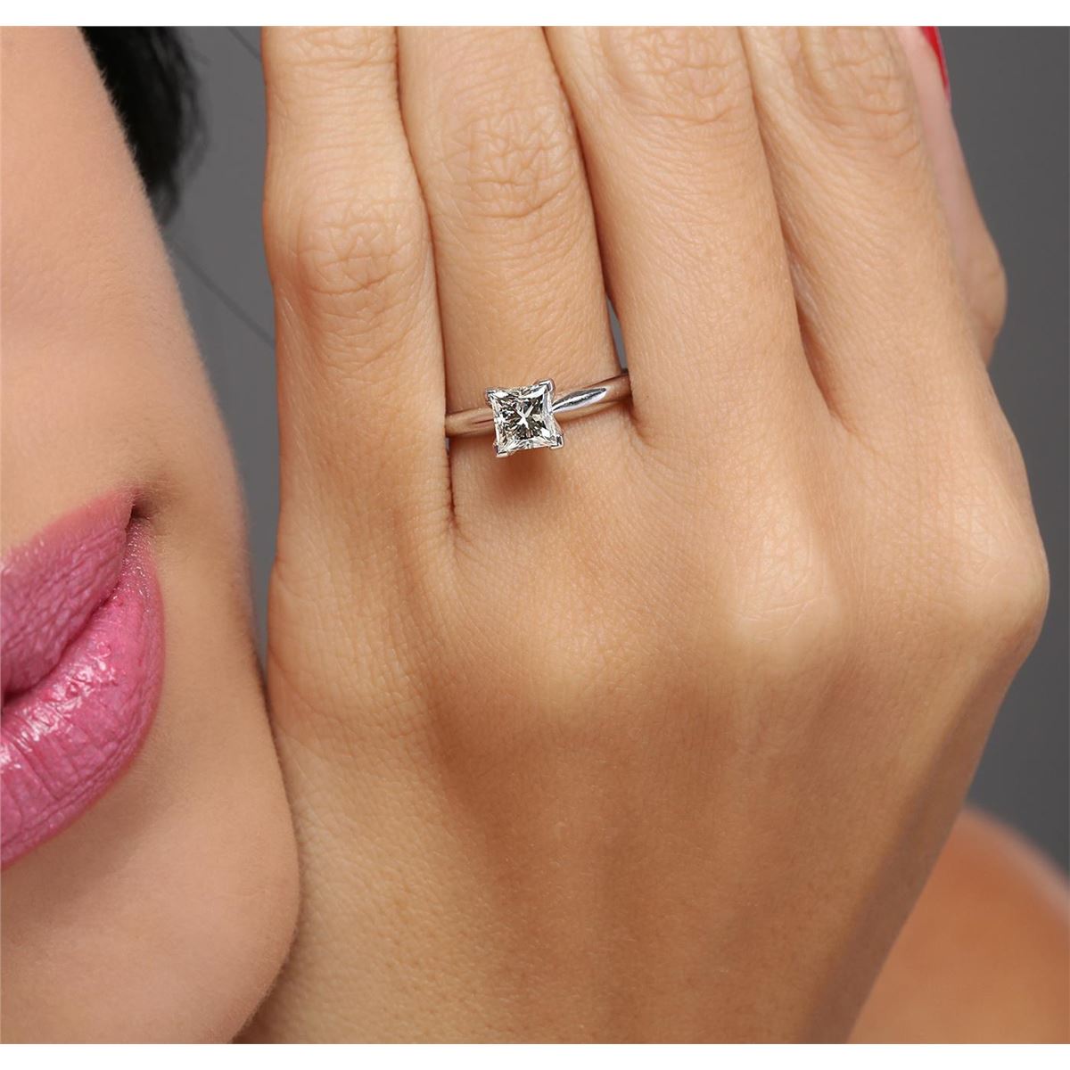 One electronically tested 14KT white gold ladies combination cast & assembled diamond solitaire ring with a bright polish finish. Identified with markings of "14K". Condition is new. Containing: One prong set princess cut diamond, measuring 5.20 x 5.20 x 3.90mm (depth est.) approximate weight of 0.87ct. Clarity: VS-2. Color: M, Cut is Good. All diamonds are graded in the mounting, unless otherwise stated. Total Weight of Diamonds 0.87ct. Total Weight of Solitaire Ring 2.20 grams. GGL Appraised at $4,020.00.