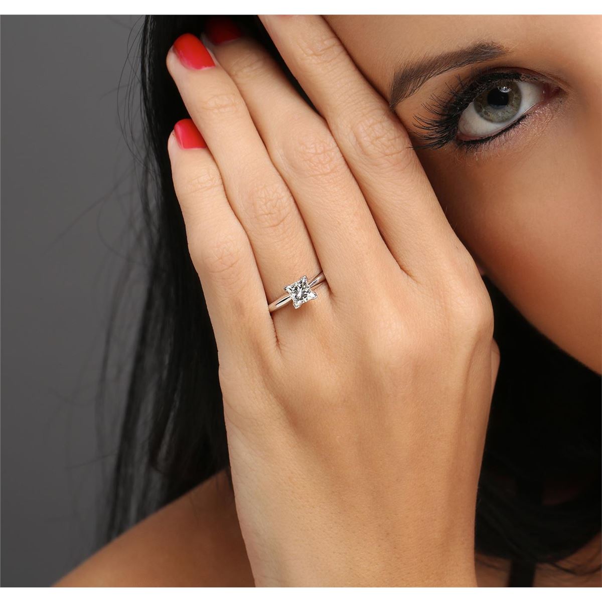 One electronically tested 14KT white gold ladies combination cast & assembled diamond solitaire ring with a bright polish finish. Identified with markings of "14K". Condition is new. Containing: One prong set princess cut diamond, measuring 5.20 x 5.20 x 3.90mm (depth est.) approximate weight of 0.87ct. Clarity: VS-2. Color: M, Cut is Good. All diamonds are graded in the mounting, unless otherwise stated. Total Weight of Diamonds 0.87ct. Total Weight of Solitaire Ring 2.20 grams. GGL Appraised at $4,020.00.