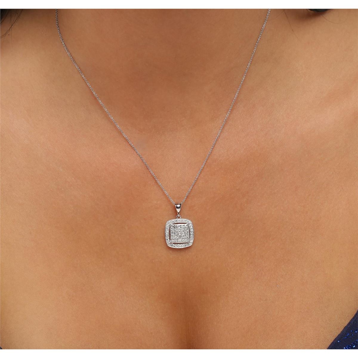 One electronically tested 14KT white gold ladies cast diamond pendant & chain 16.0" long, cable link with a spring ring clasp with a bright polish finish. Identified with markings of "14K". Condition is new. Containing: Twenty-Five invisible set princess cut diamonds, measuring 1.70 x 1.70 x 1.28mm (depth est.) approximate total weight of 25 Stones = 0.76ct. Clarity: SI-1. Color: I - J, Cut is Good. Thirty-Two prong set round brilliant cut diamonds, measuring 1.00. - 1.00. x 0.60mm (depth est.) approximate total weight of 32 Stones = 0.12ct. Clarity: SI-2 to I-1. Color: I - J, Cut is Good. All diamonds are graded in the mounting, unless otherwise stated. Total Weight of Diamonds 0.87ct. Total Weight of Pendant & Chain 3.30 grams. GGL Appraised at $3,025.00.